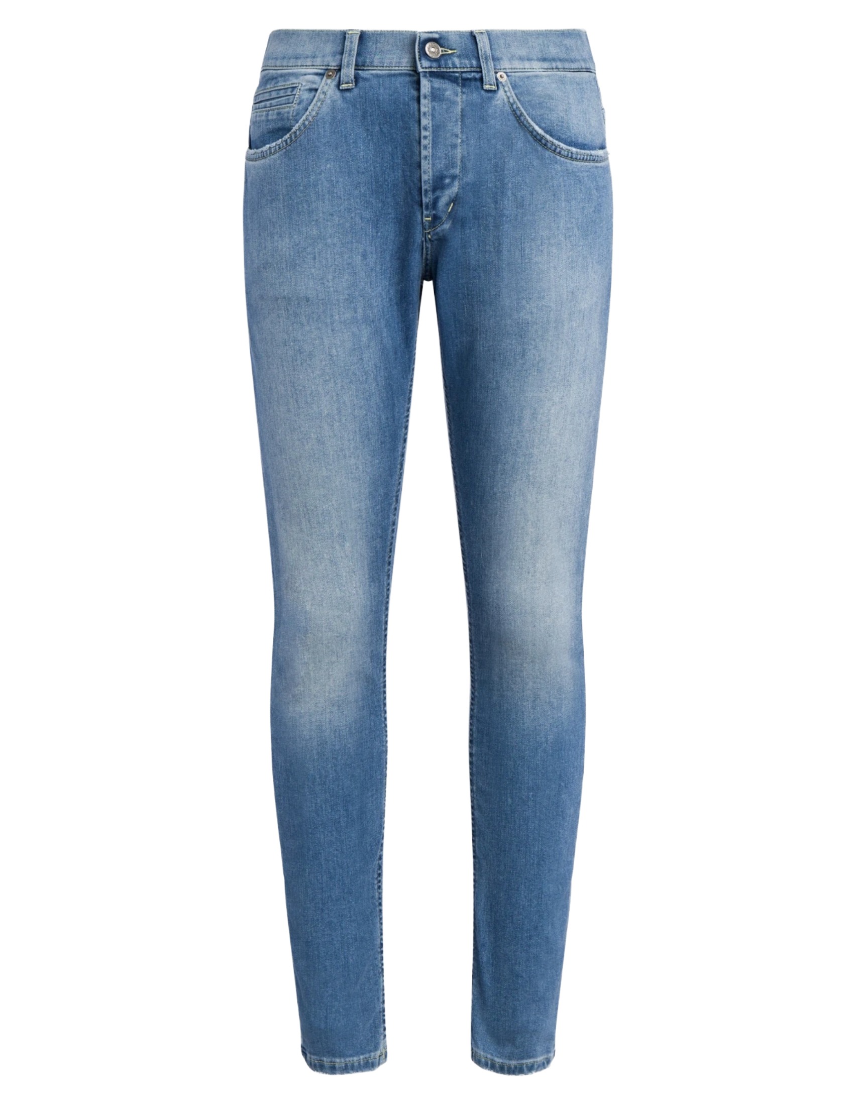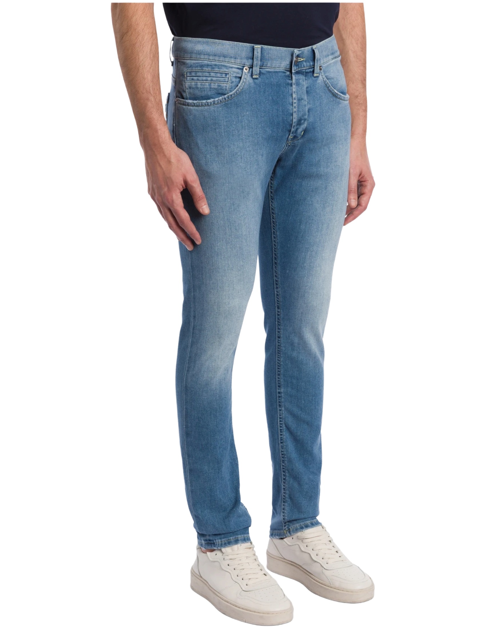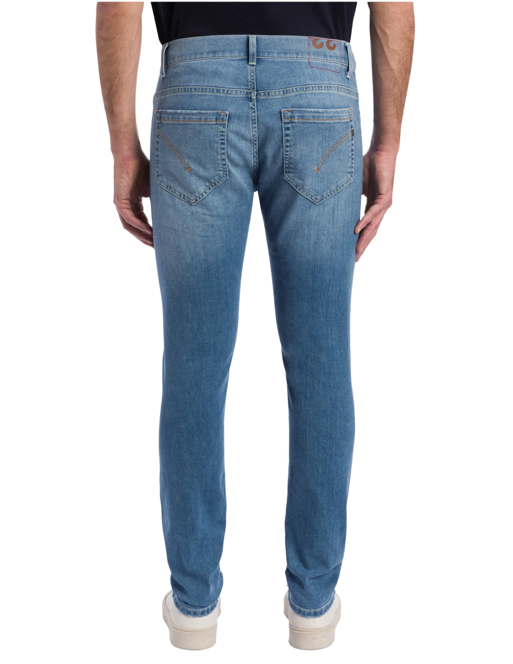 George five-pocket skinny jeans, low rise, welt pocket. 9 oz Coolmax blue stretch denim. Clean medium-light wash. Dondup logo. Made in Italy.