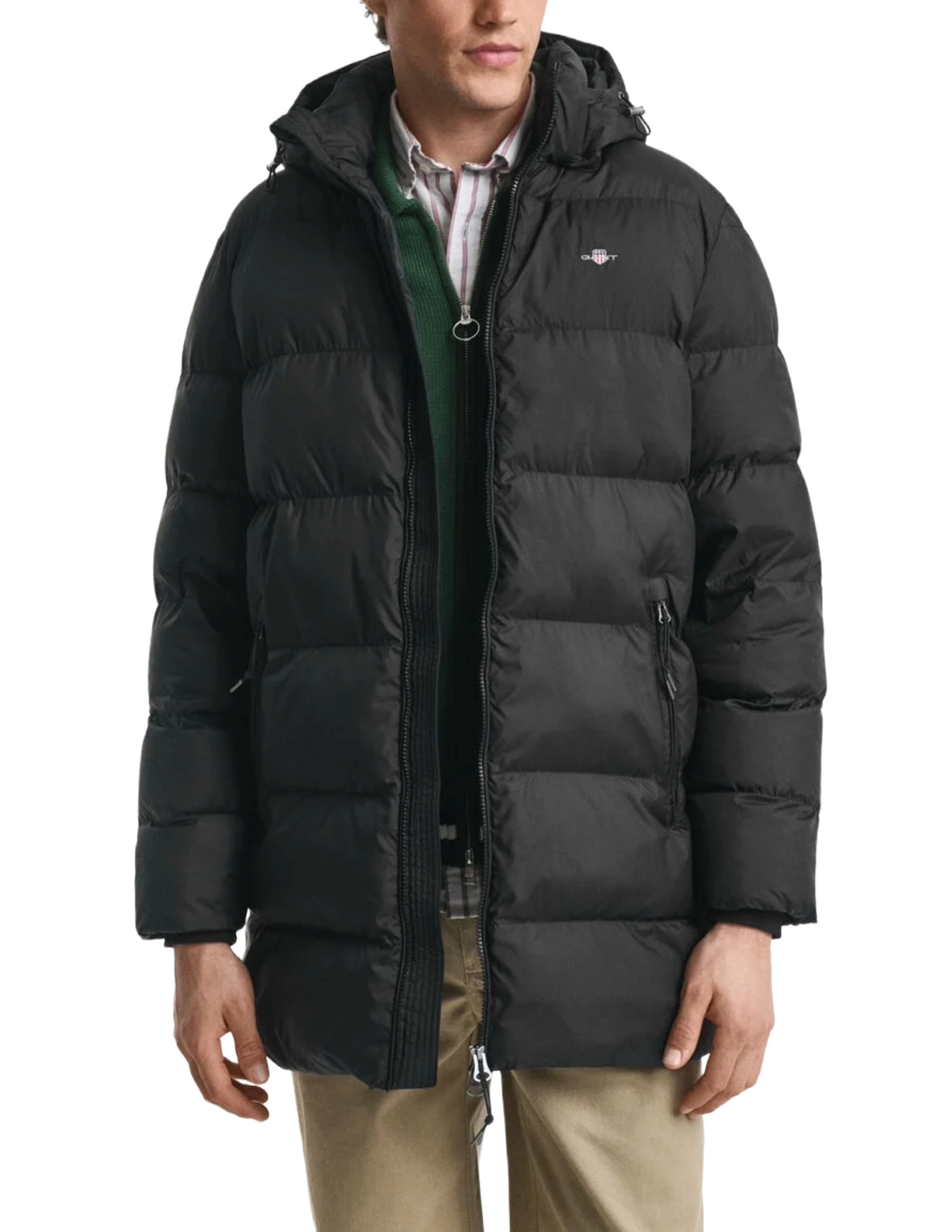 Perfect for days outdoors, the Active Cloud jacket is designed for a regular fit and treated with a water-repellent finish. Styled like a puffer jacket, it features a front zip closure and a removable hood with an adjustable drawstring. The jacket is fully lined with padded insulation and features zipped side pockets, elastic cuffs, and an embroidered GANT graphic on the chest. The jacket has a DWR (durable water repellent) finish to help shed water in light rain.