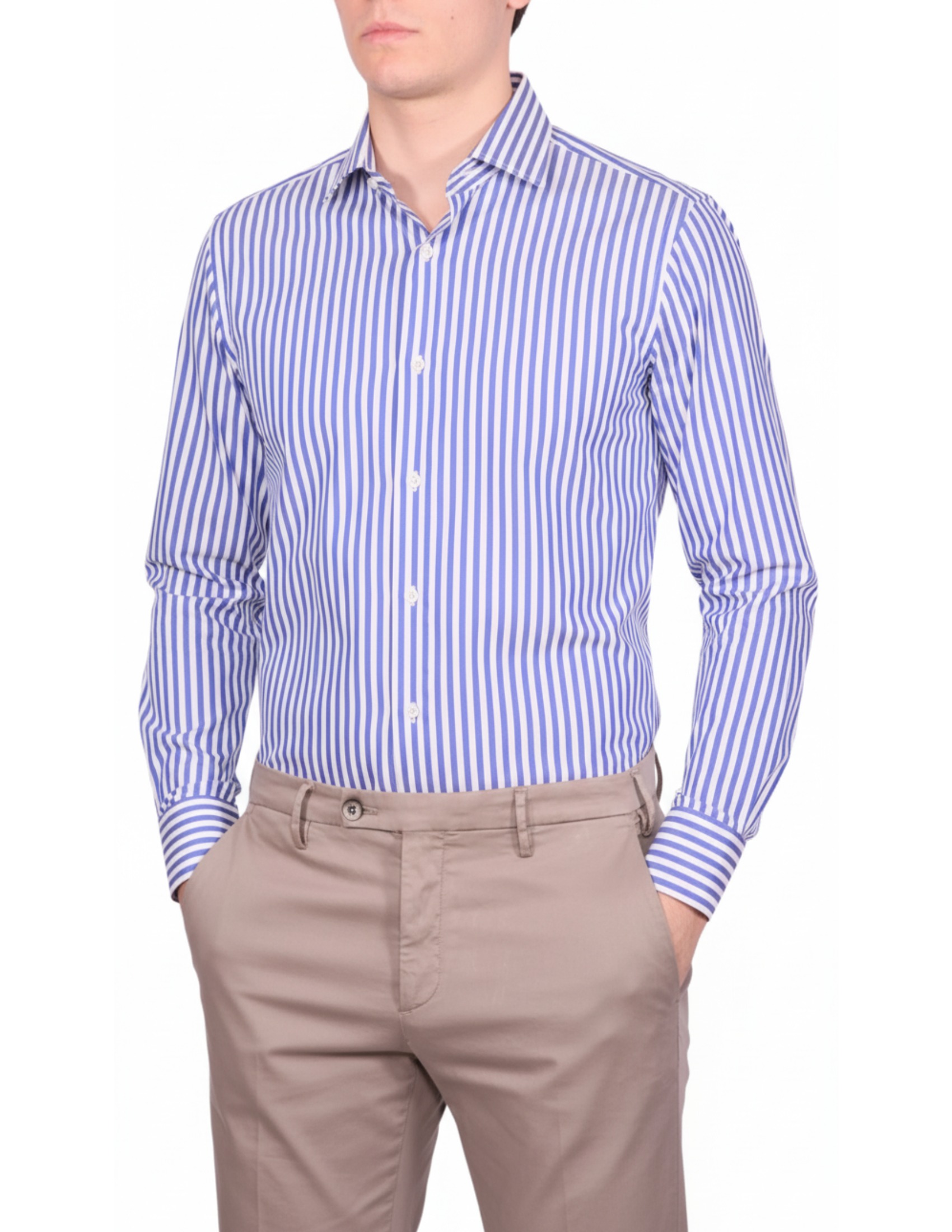 For a bolder look, the Lori shirt in deep blue stripes is the ideal choice. The quality of 100% Italian cotton ensures optimal crease retention and long-lasting comfort, maintaining the high standards of Italian tailoring tradition.