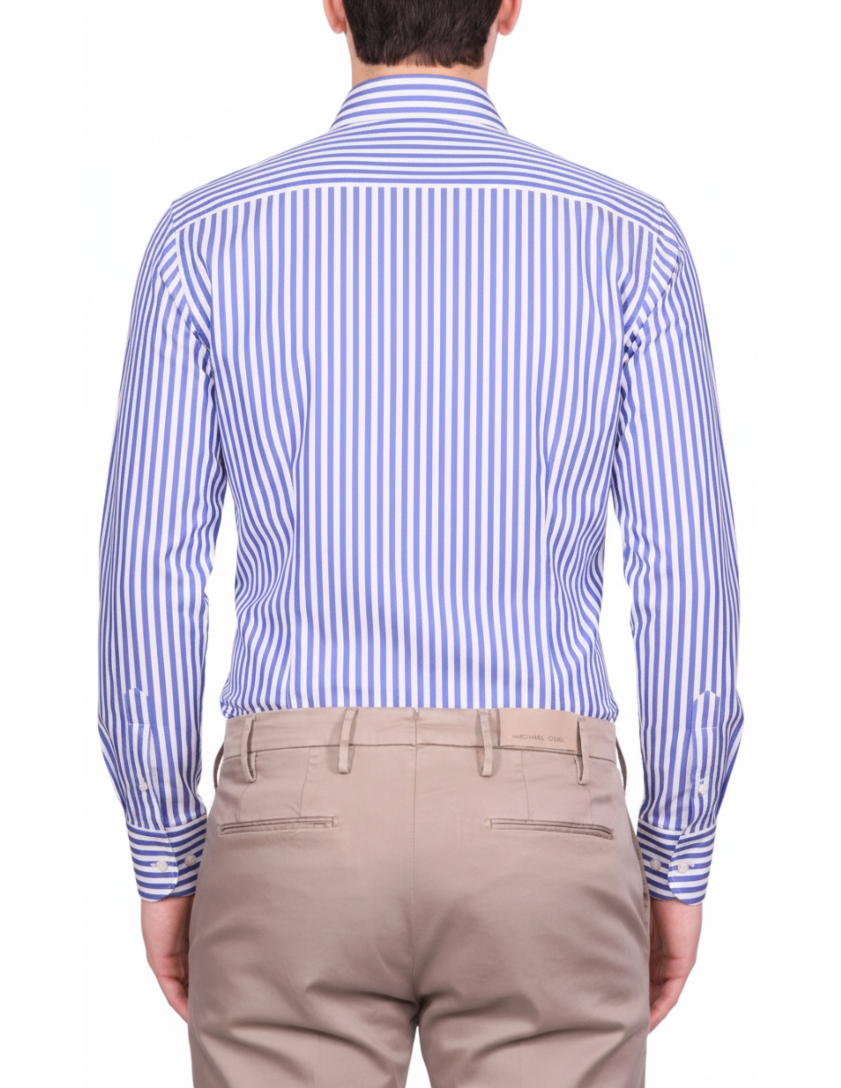 The sharp contrast between the white and blue stripes accentuates the figure and pairs perfectly with navy blue or anthracite gray pieces, ensuring a confident and always refined image.