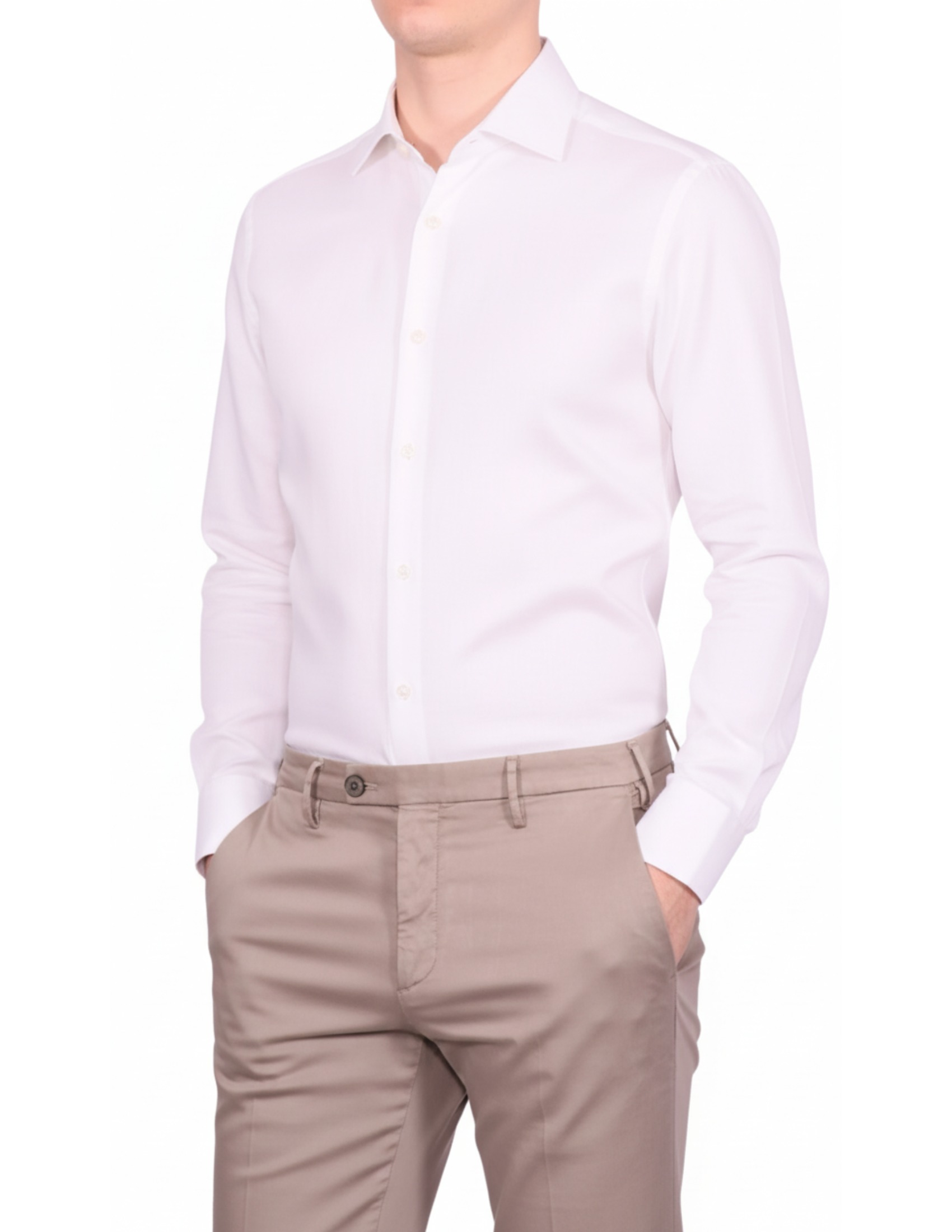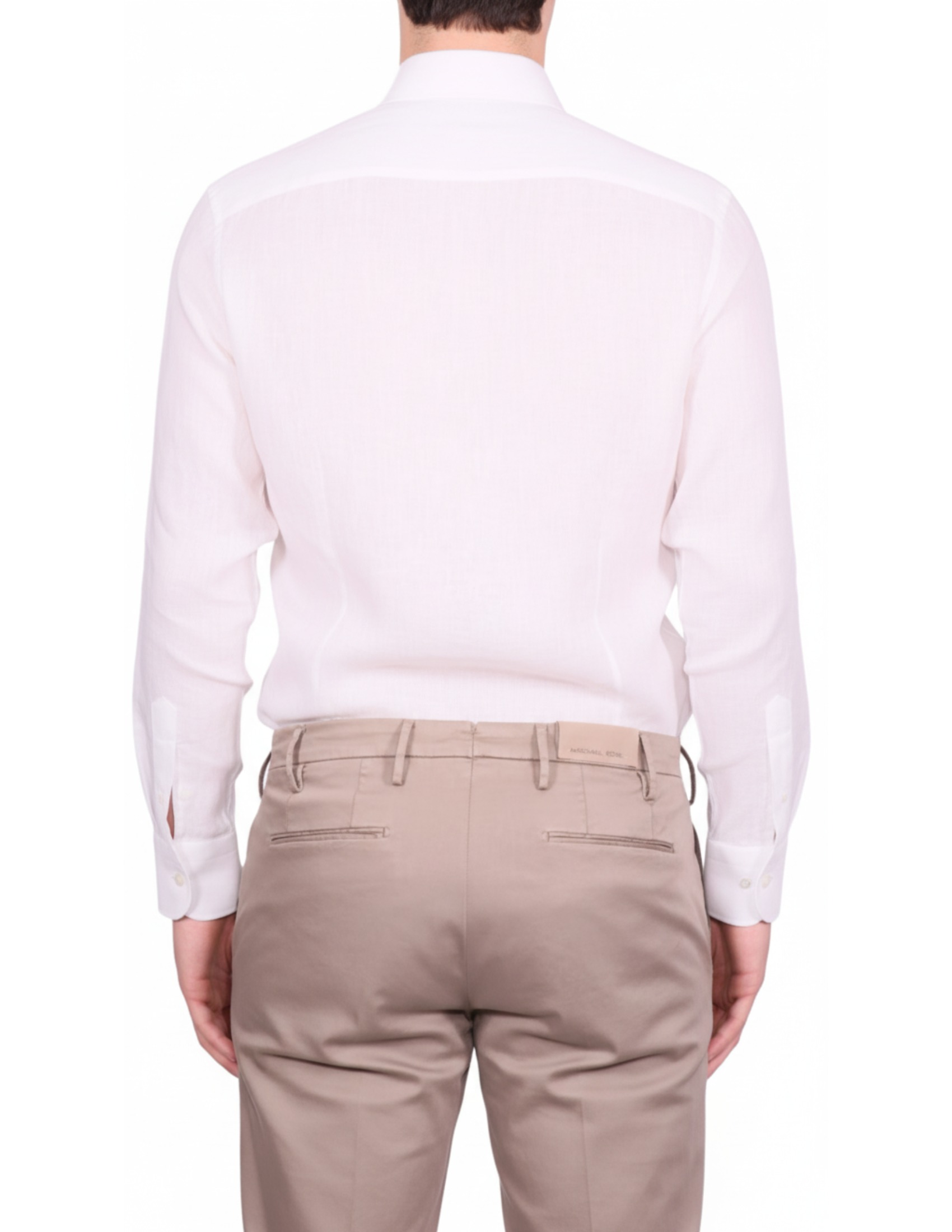 The timeless Optic White shade lends the piece a touch of maximum brightness and formal cleanliness. The characteristic irregular texture of linen lends a pleasant visual dynamism and a relaxed allure, making it a versatile and distinctive piece. The clean design, with a classic collar and regular fit, ensures optimal comfort for every occasion.