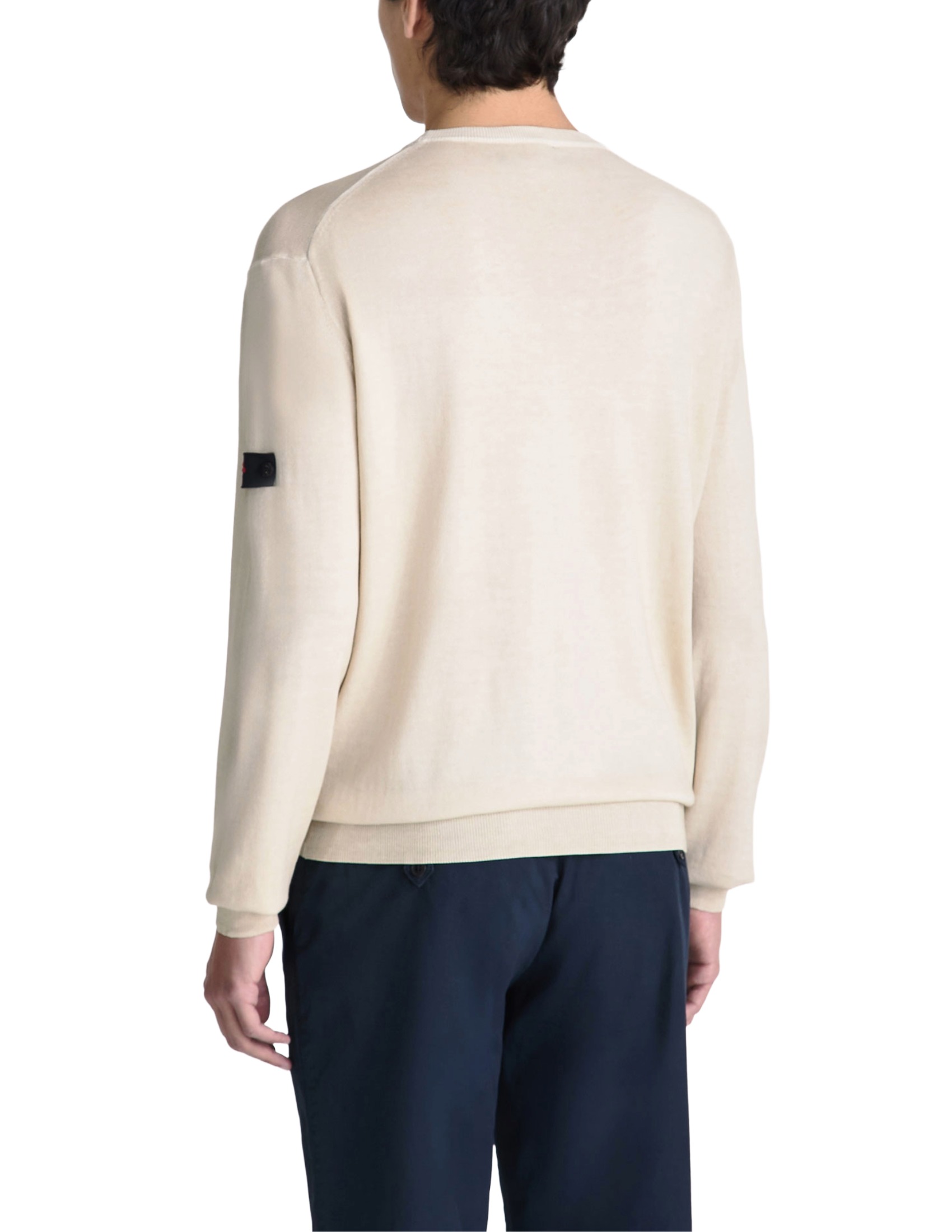 Garment-dyed cotton tricot crewneck sweater with a unique, used-effect look. Featuring long sleeves, ribbed cuffs and hem, this piece has a regular fit, ideal for a variety of occasions. The personalized label on the left sleeve with two buttons adds a distinctive touch. A lightweight sweater with a bold personality, perfect for enhancing casual or elegant outfits.