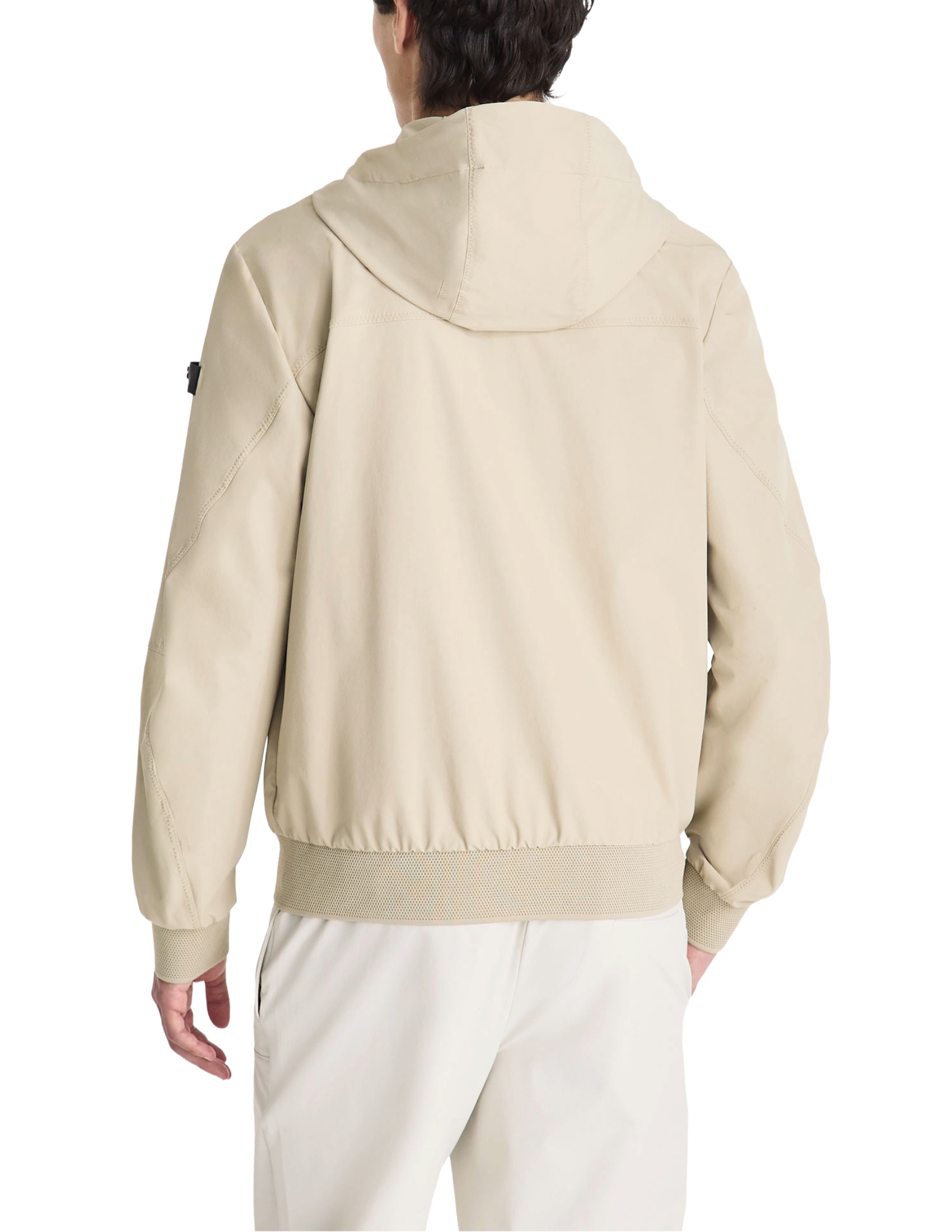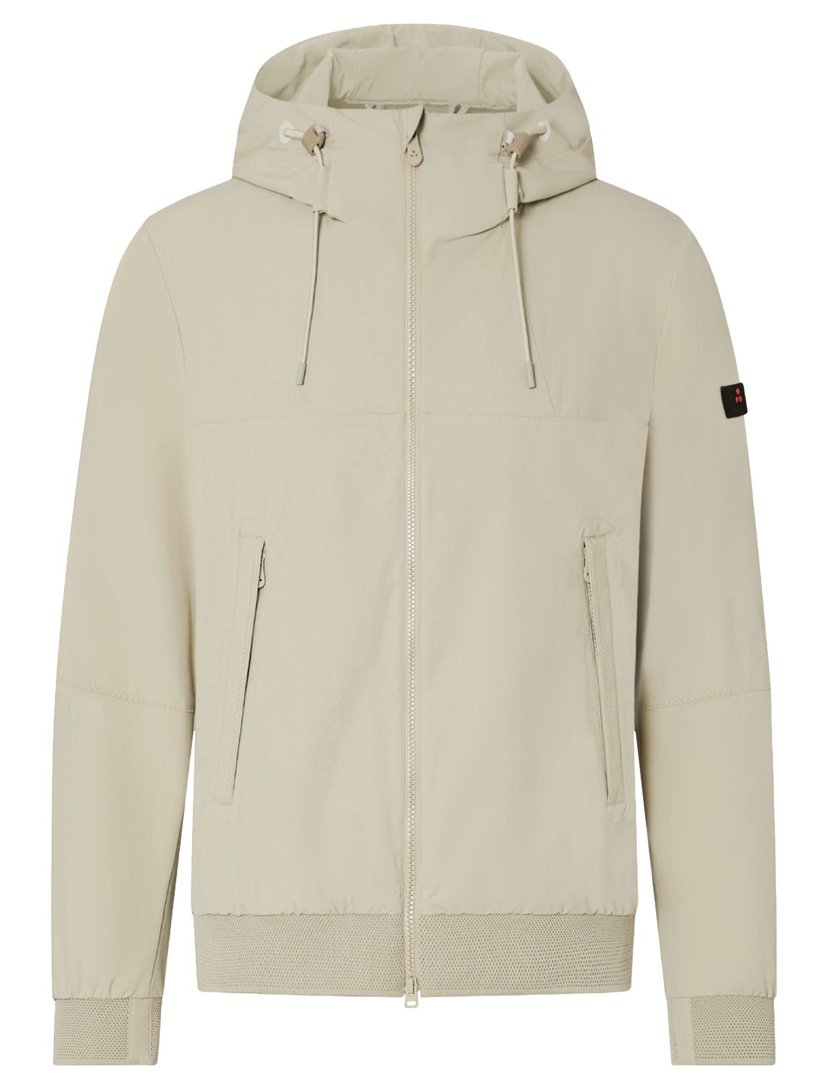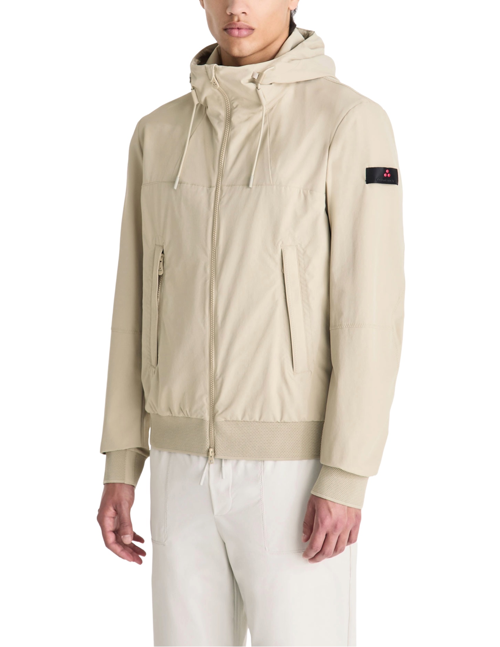 Short hooded jacket made of twisted stretch nylon fabric, characterized by a matte and slightly wavy look, achieved through the use of textured yarns. Featuring a hood with adjustable drawstrings, a full two-way center zip closure, side pockets, and knitted hem and cuffs. Part of the Transeasonal line, which balances advanced materials, essential design, and garments designed to transition effortlessly through the seasons. A sporty piece reinterpreted with a contemporary flair, perfect for combining comfort and style.