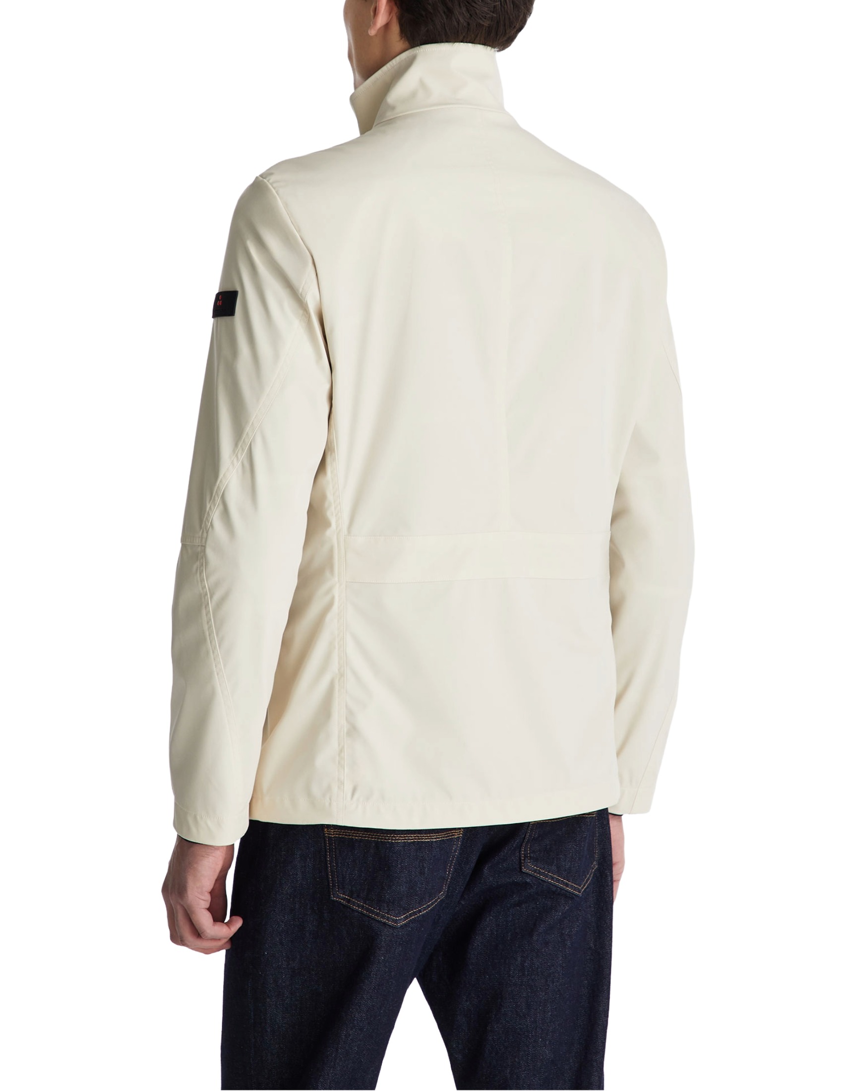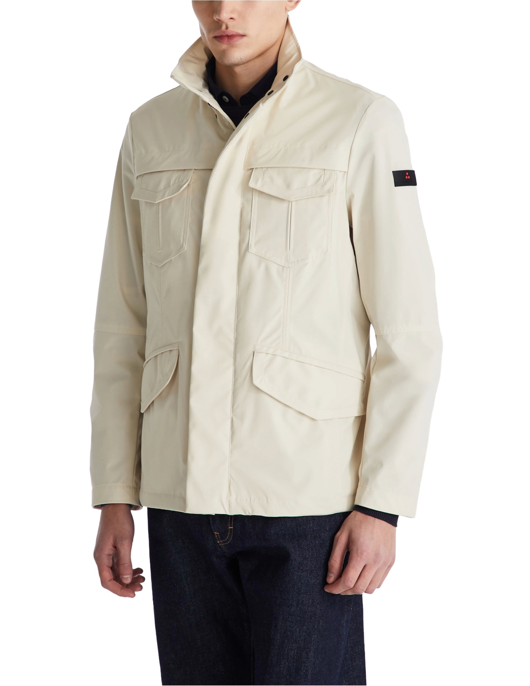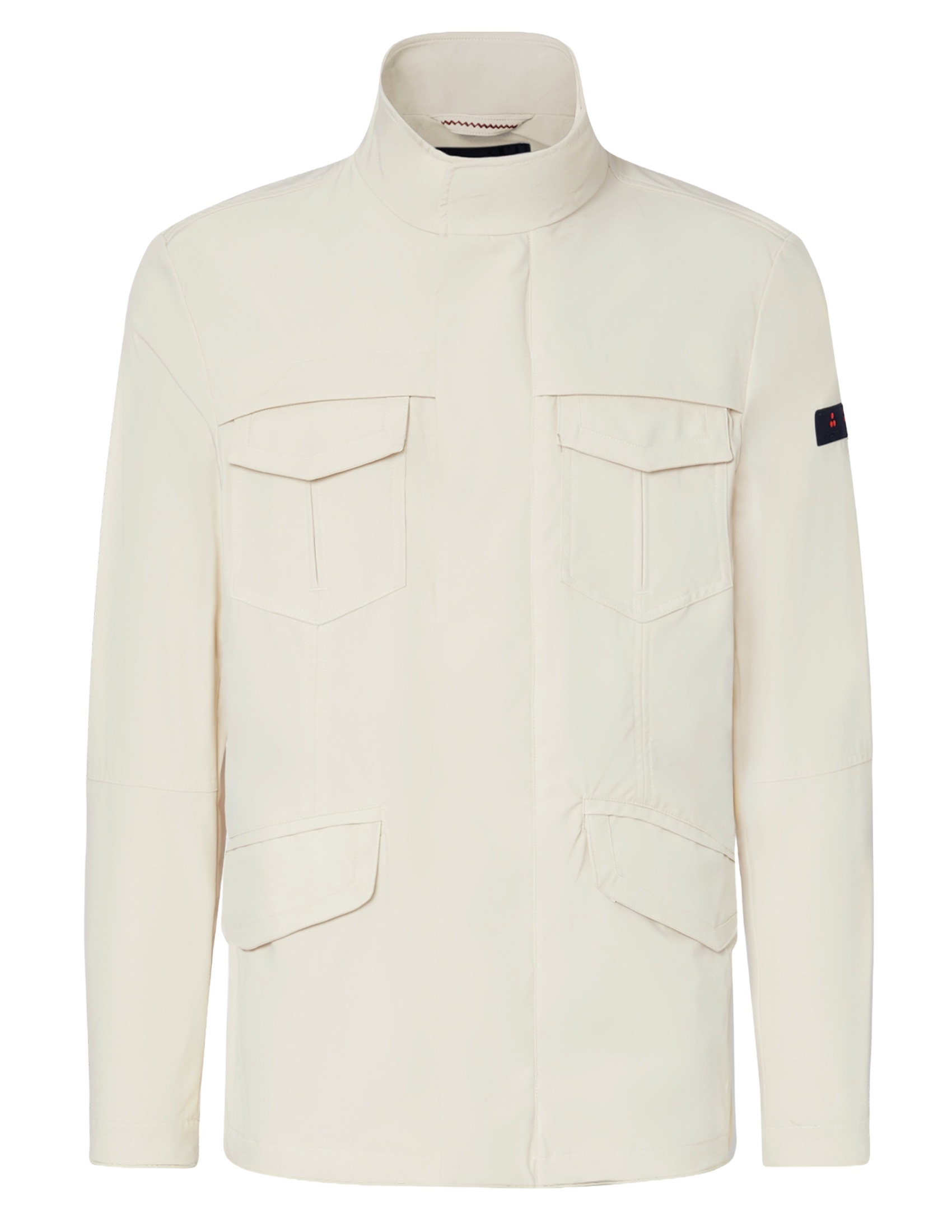 Field jacket made of stretch polyester canvas bonded to a soft and warm polyester jersey, made comfortable by the fineness of the yarns used. The design recalls the iconic model with four patch pockets, two of which are on the chest, with flap closures, a stand-up collar, and a full zip front closure concealed by a flap. A lightweight and contemporary reinterpretation of a great men's wardrobe classic, combining functional elegance and modern comfort.