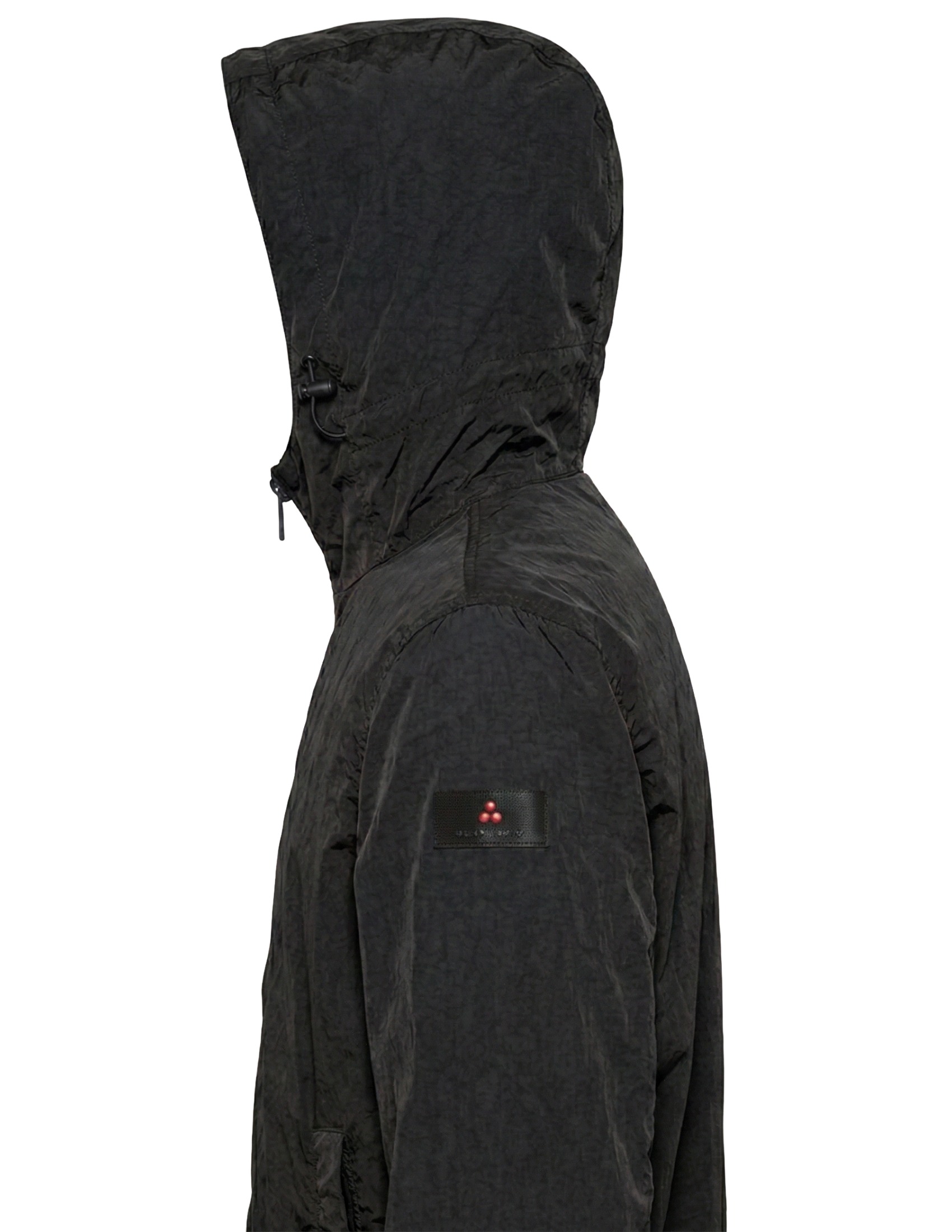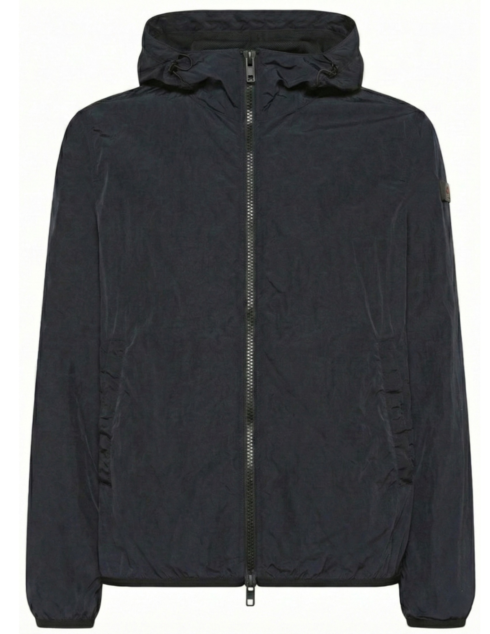 Lightweight nylon windbreaker. Crinkle look obtained through the dyeing and finishing process. Full central black zip, side pockets and fixed hood with drawstrings. This water-repellent model ensures thermal insulation and moisture resistance. This performance and dynamic style garment is perfect for dealing with unpredictable weather.