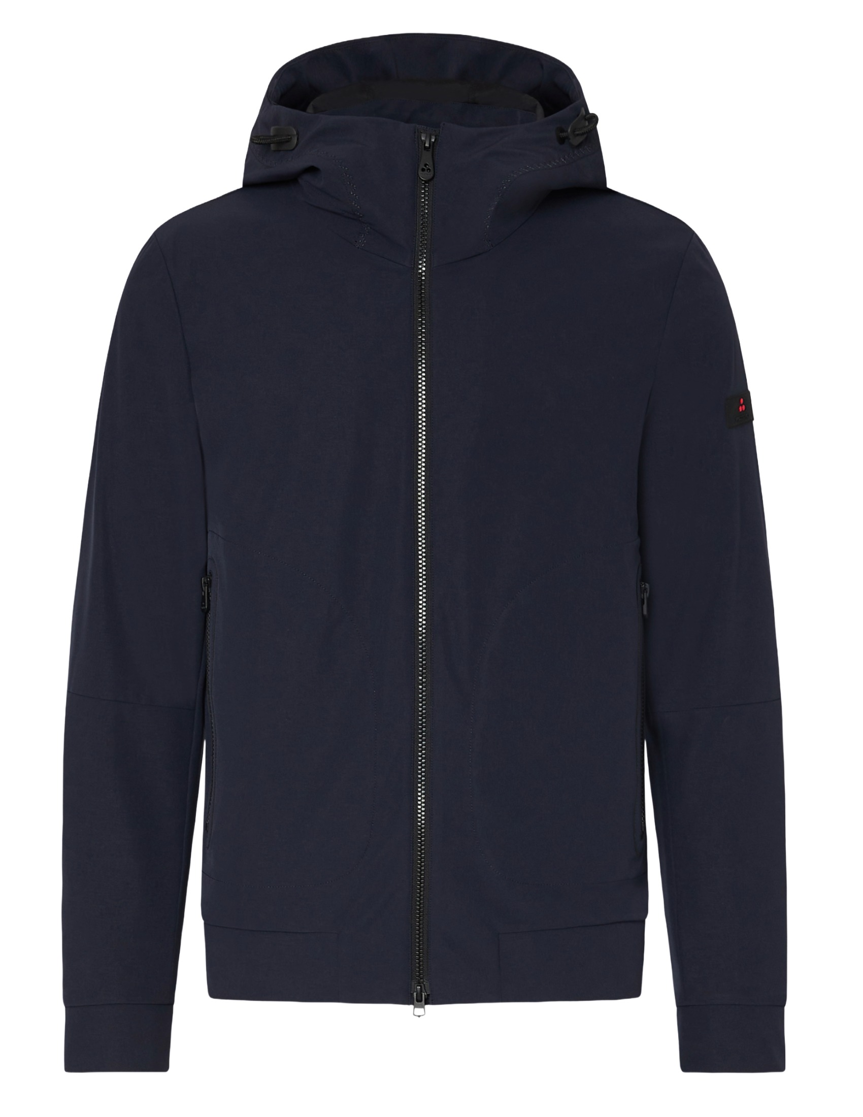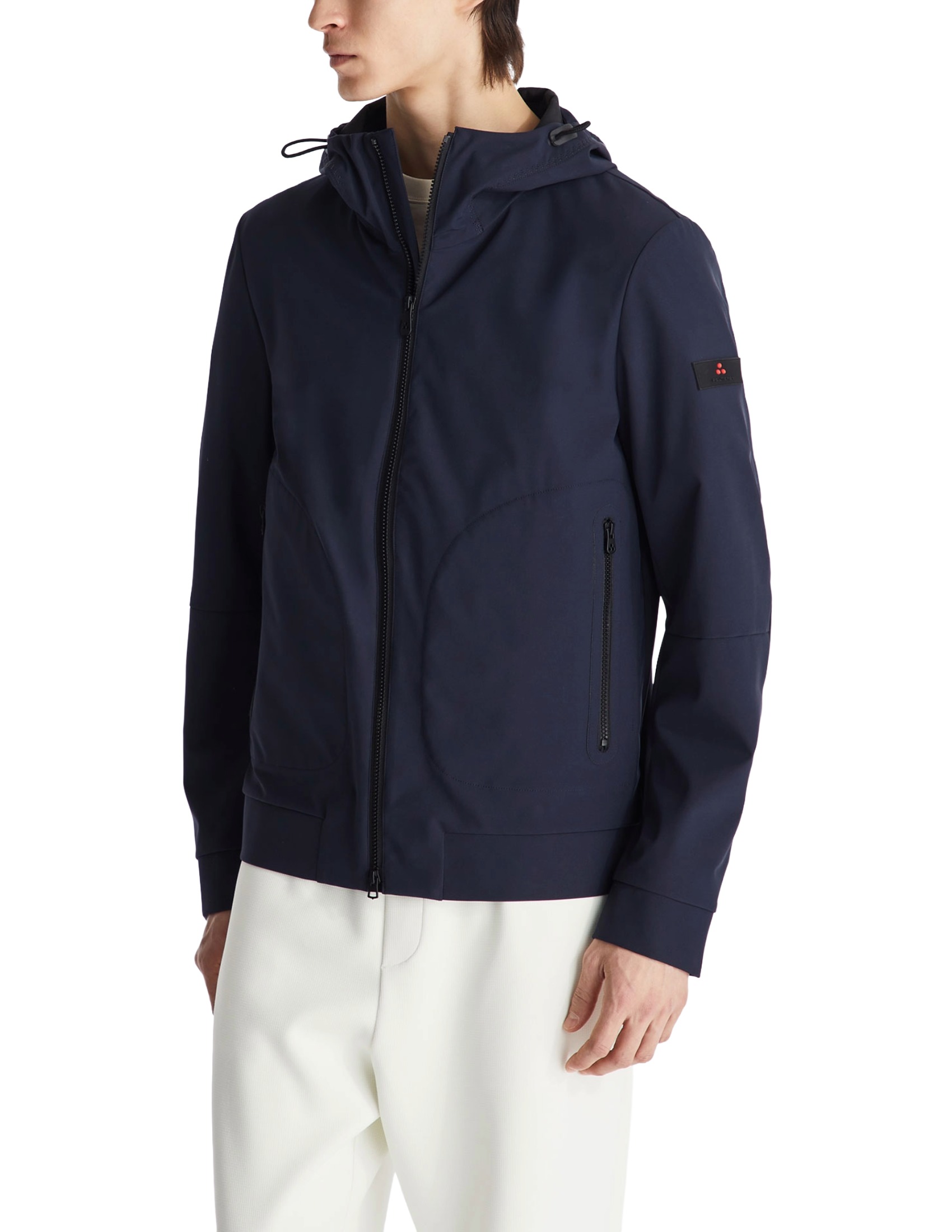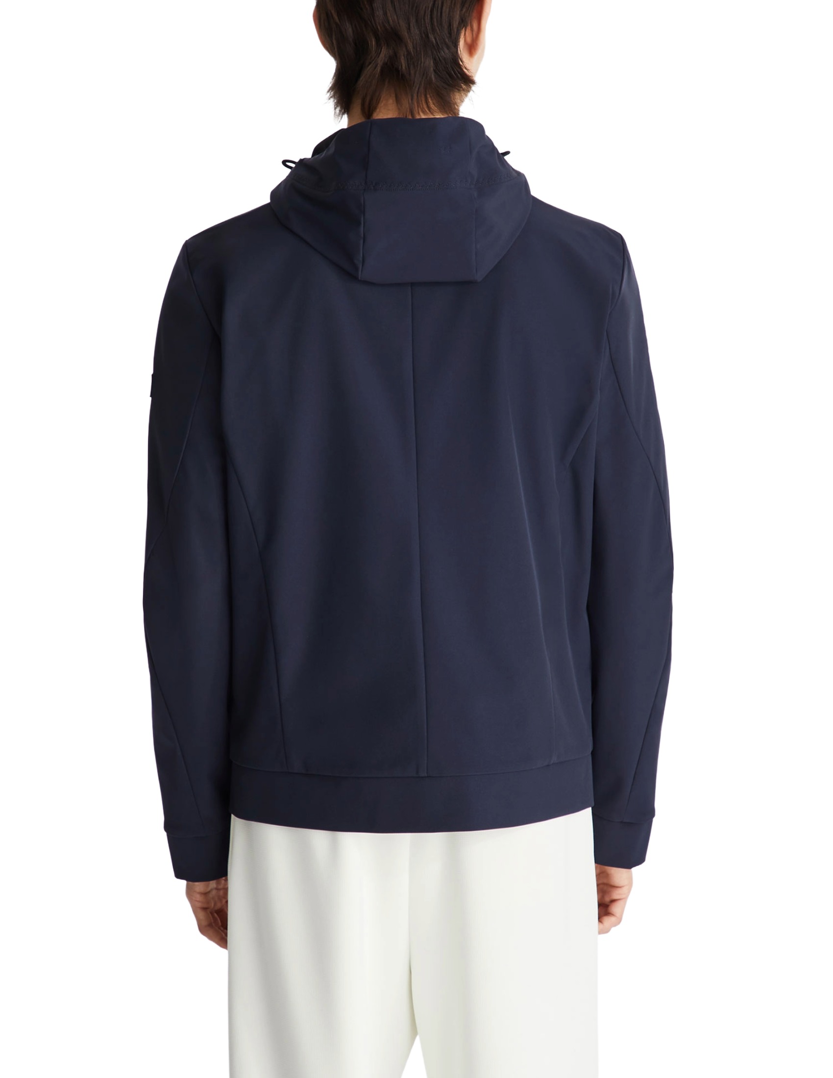 A short, lightweight windbreaker jacket in stretch polyester, bonded to a soft, thermal jersey lining for maximum comfort on transitional days. Featuring a full black center zip, large side pockets, and a fixed drawstring hood, this unlined model with its minimal, clean lines embodies the concept of understated and practical elegance, as well as being versatile and functional. Water-repellent and PFC-free, it does not contain any environmentally harmful chemicals.