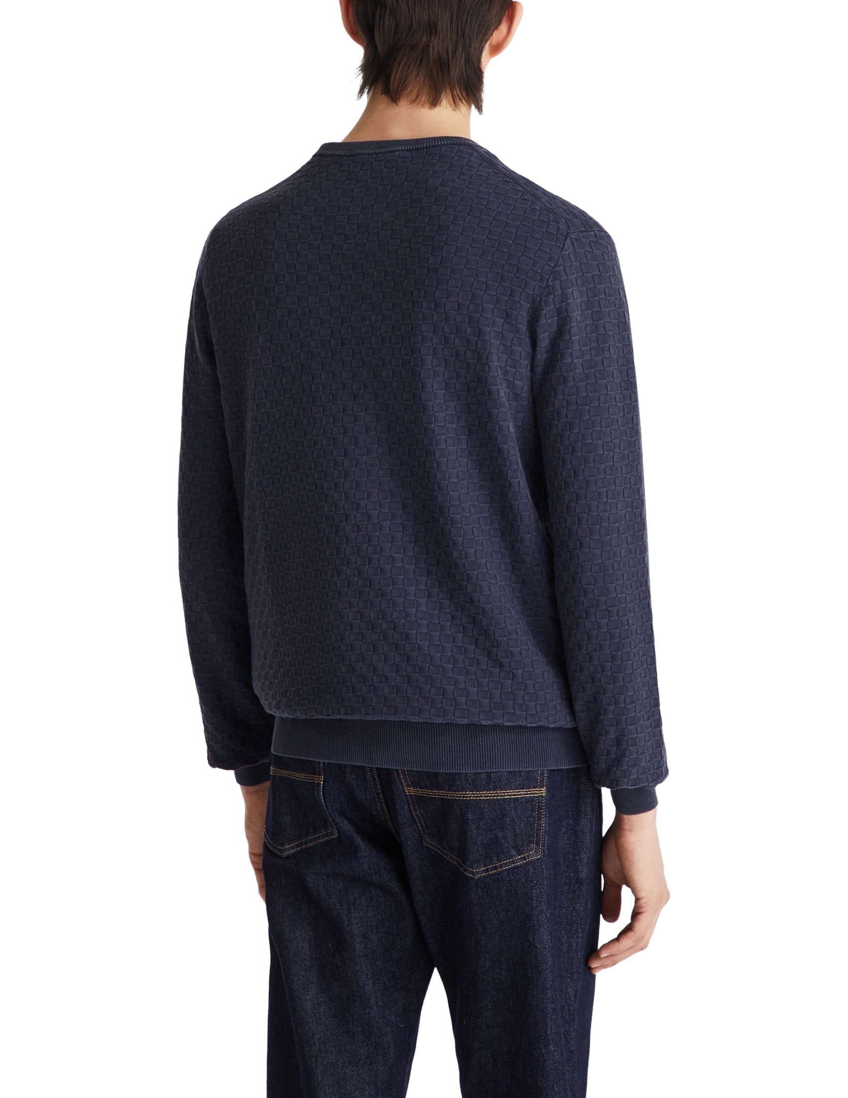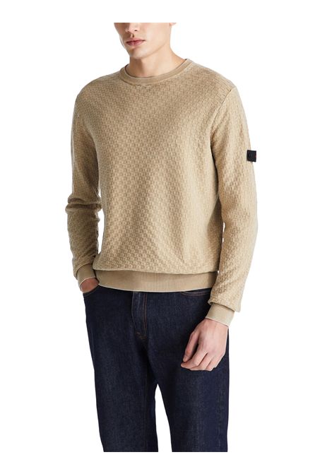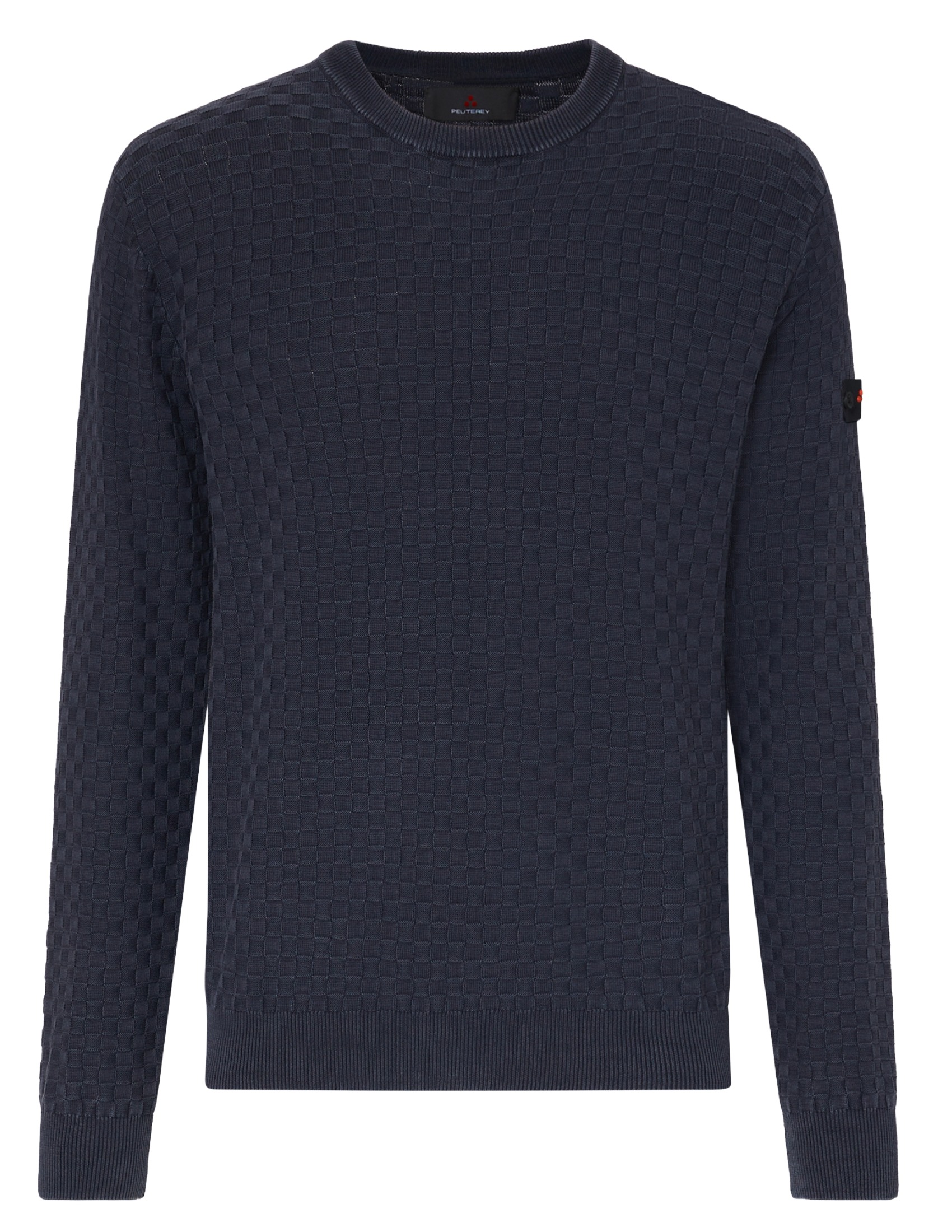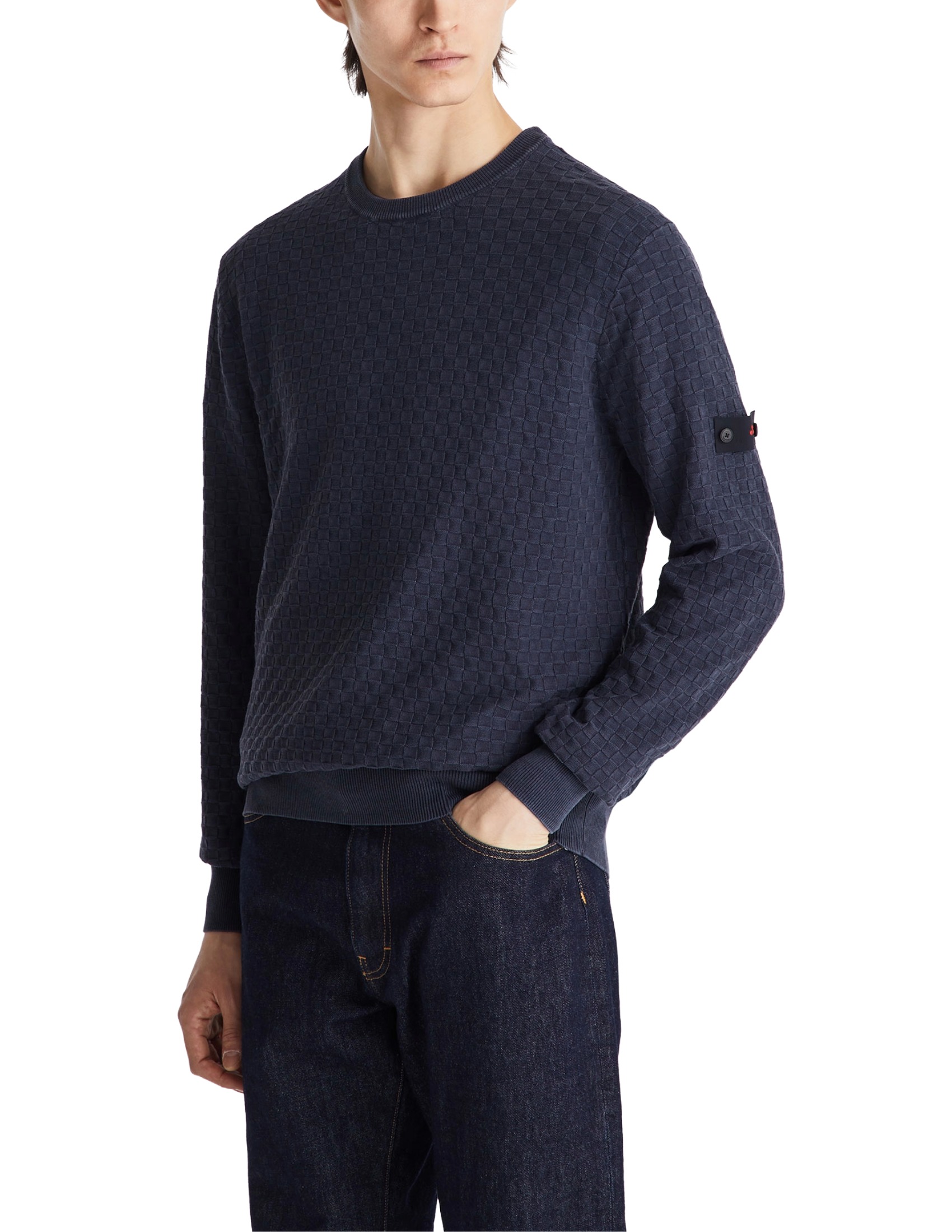 Garment-dyed, textured cotton tricot crewneck sweater featuring a sophisticated geometric design and a regular fit, with ribbed cuffs and hem. The clean design is enhanced by the personalized Peuterey logo on the left sleeve, applied with two buttons, adding a distinctive detail. A basic, modern piece, the refined texture of the fabric enhances style and personality while ensuring comfort and lightness.