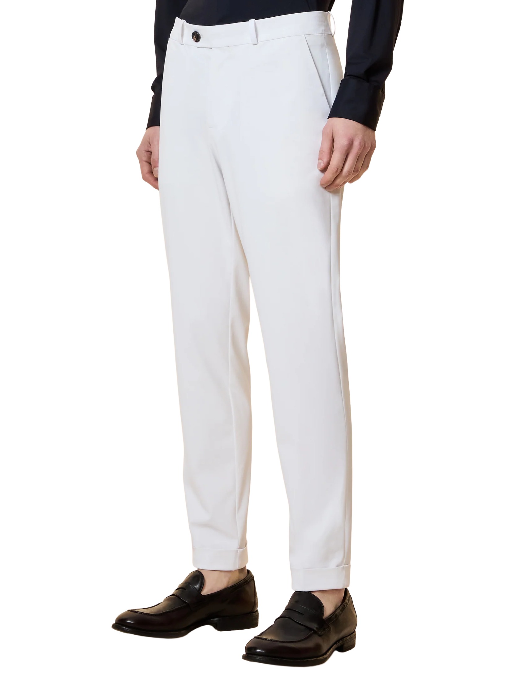A balanced expression of comfort, style, and versatility: this highly successful continuation model is a must-have for any men's spring and summer wardrobe. Crafted from our exclusive stretch fabricfresh and breathable, lightweight and with a smooth, soft feelthe style stands out for its super-matte finish that enhances the clean, tailored cut. The regular fit is defined by the belt loops, finished internally with a band printed with the tone-on-tone Razzle Dazzle monogram. The elegant horn button placket with a concealed zip fly closes. The side French pockets complement the rear welt pockets, enhanced by the iconic black micro-injected logo on the right side. The turn-up ankle is a distinctive feature of contemporary tailoring. The crease-resistant and easy-care qualities make the style ideal for everyday wear. Perfect paired with a lightweight SURFLEX® blazer and an Oxford shirt or T-shirt, these chinos effortlessly create a distinctive smart-casual outfit.