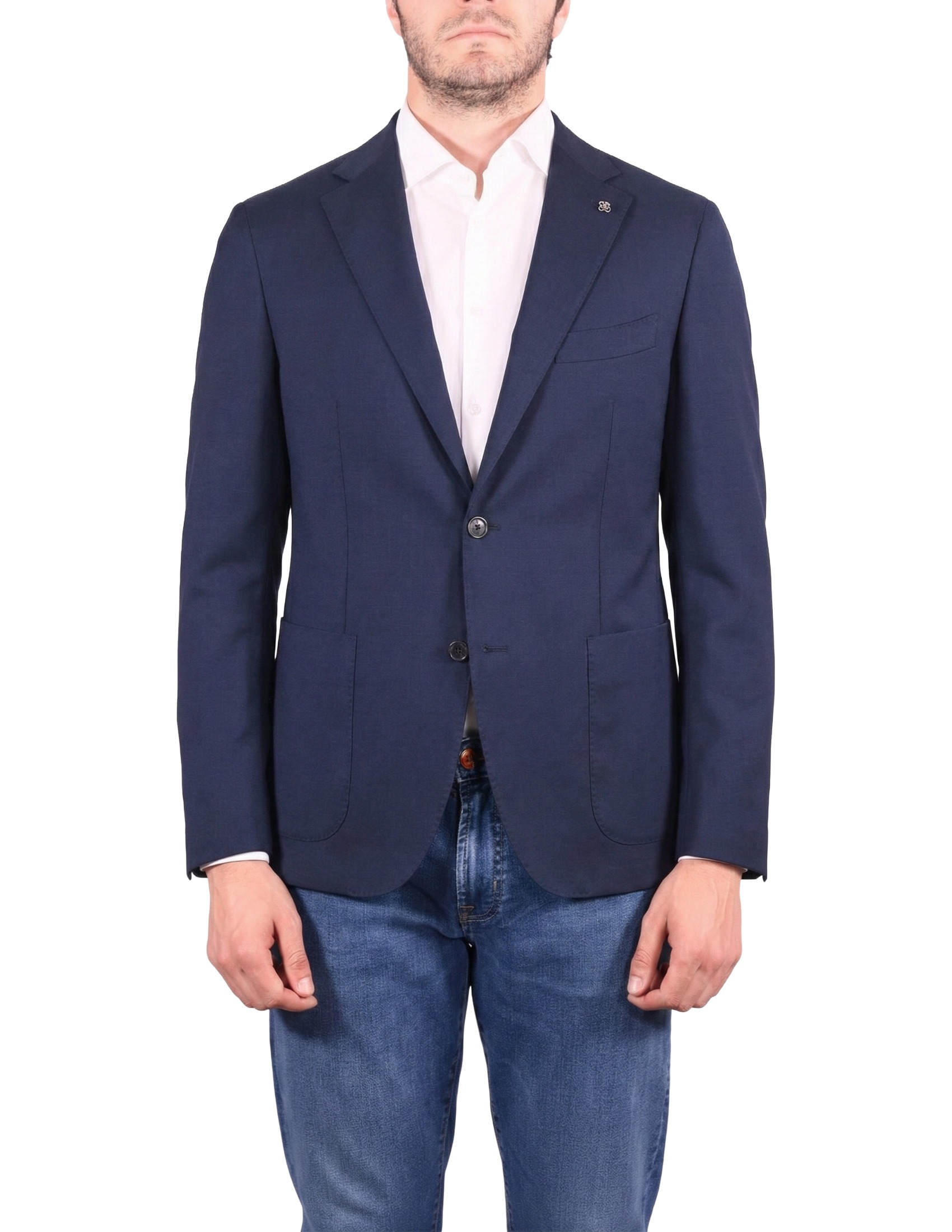 The design features classic notch lapels adorned with the iconic Tagliatore lapel pin, patch pockets for a sophisticated casual-chic touch, and a two-button closure that enhances its modern, tailored cut.