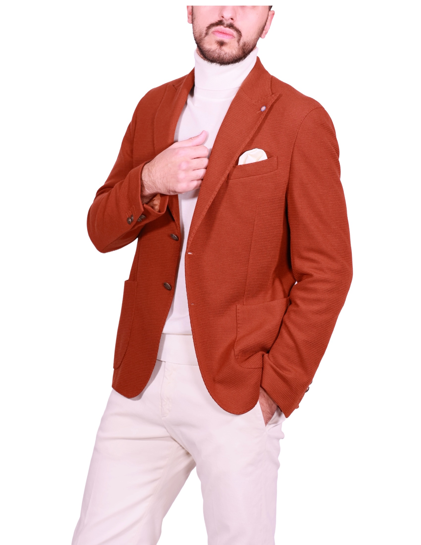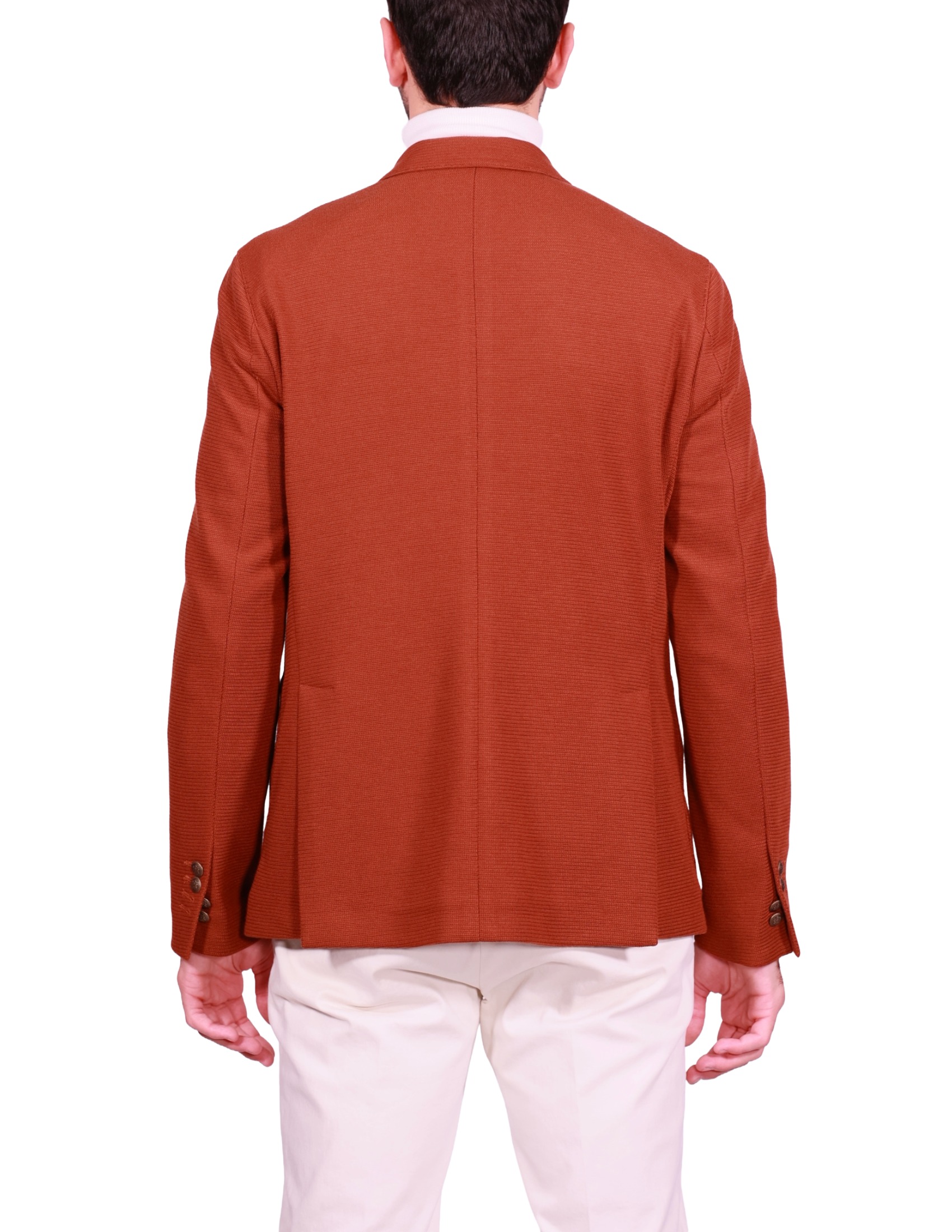 Il tessuto tecnico (98.5% Poliestere, 1.5% Elastan) garantisce una vestibilità flessibile e confortevole, massima resistenza alle pieghe e facilità di manutenzione. La trama è micro-operata nel colore Ruggine (o Terracotta).
