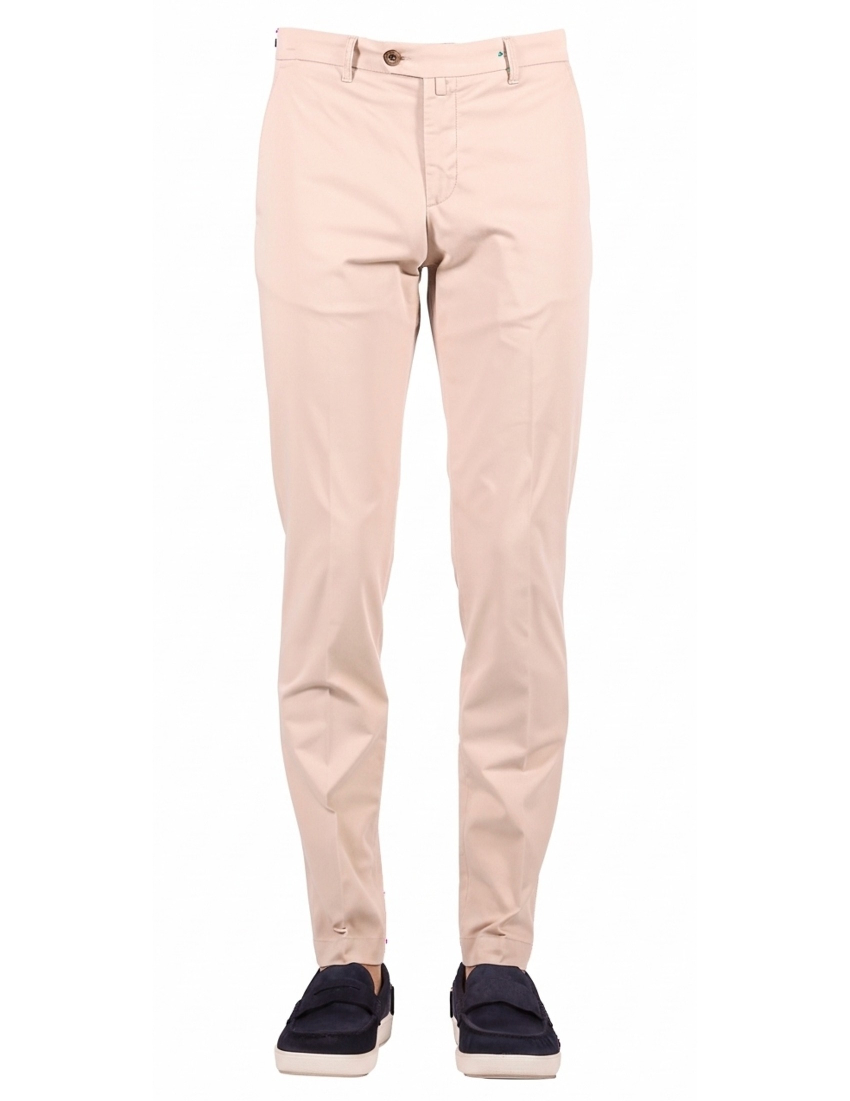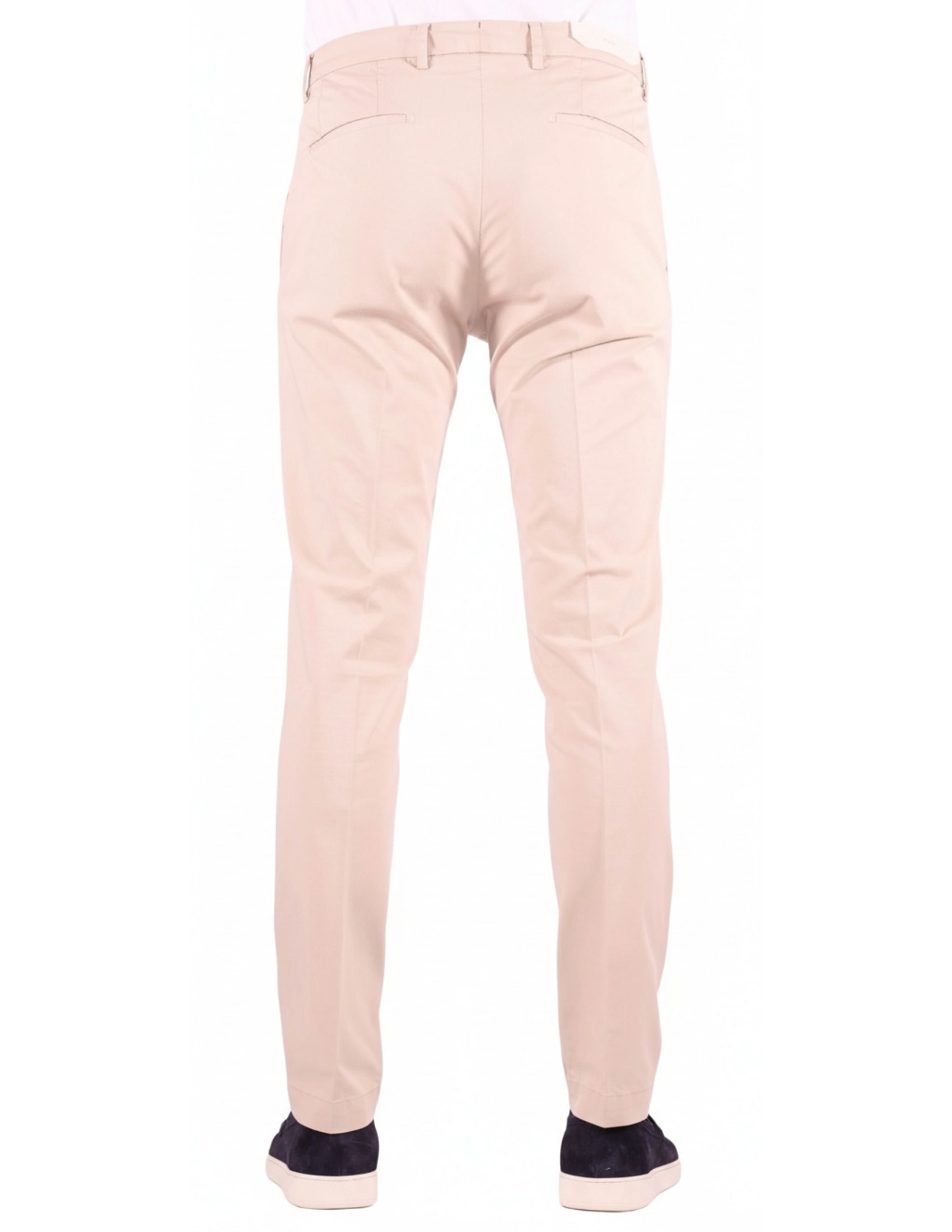 Realizzato in pregiata Gabardina di Cotone Stretch, il capo assicura una libertà di movimento superiore senza perdere la forma originale. Il design è caratterizzato da una linea pulita con tasche anteriori a filo (modello America), che conferiscono un tocco di eleganza formale ideale sia per l'ufficio che per contesti casual-chic.