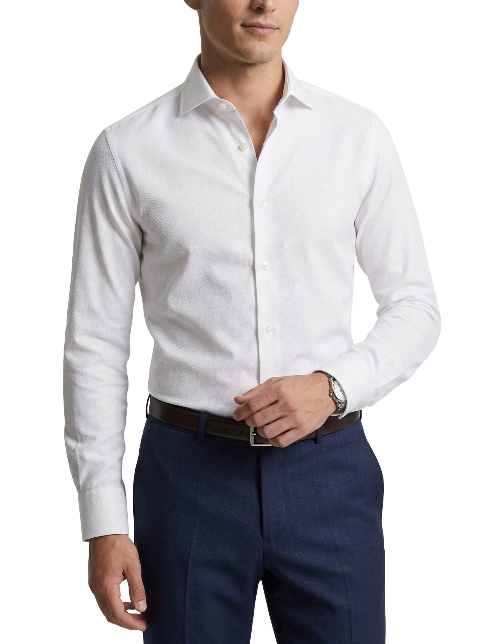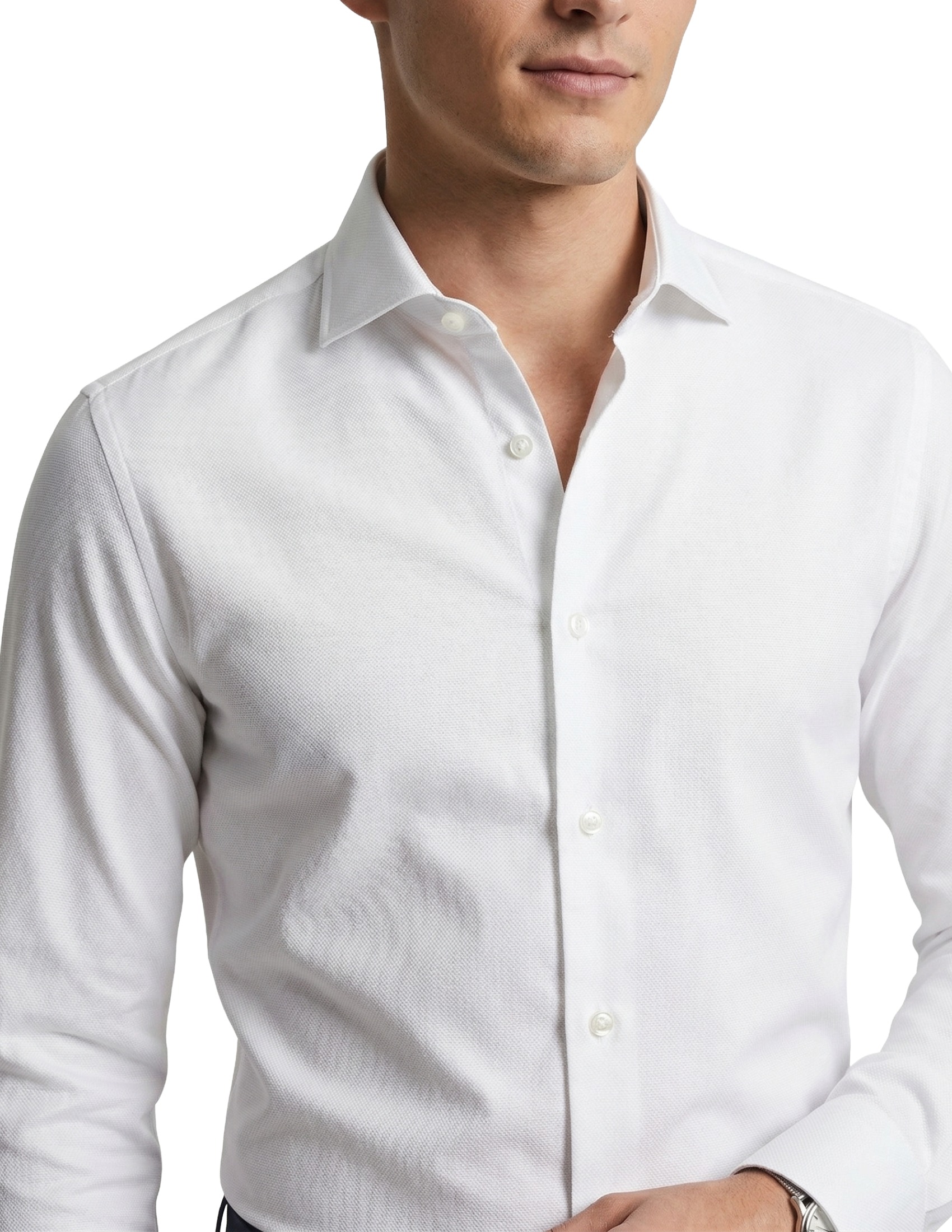 La particolare lavorazione del tessuto crea una texture tridimensionale micro-geometrica che cattura la luce in modo discreto, conferendo al bianco una profondità e una matericità superiori rispetto a un tessuto liscio. È la scelta perfetta per chi desidera una camicia da cerimonia che esprima ricercatezza attraverso il dettaglio tattile e visivo del tessuto.