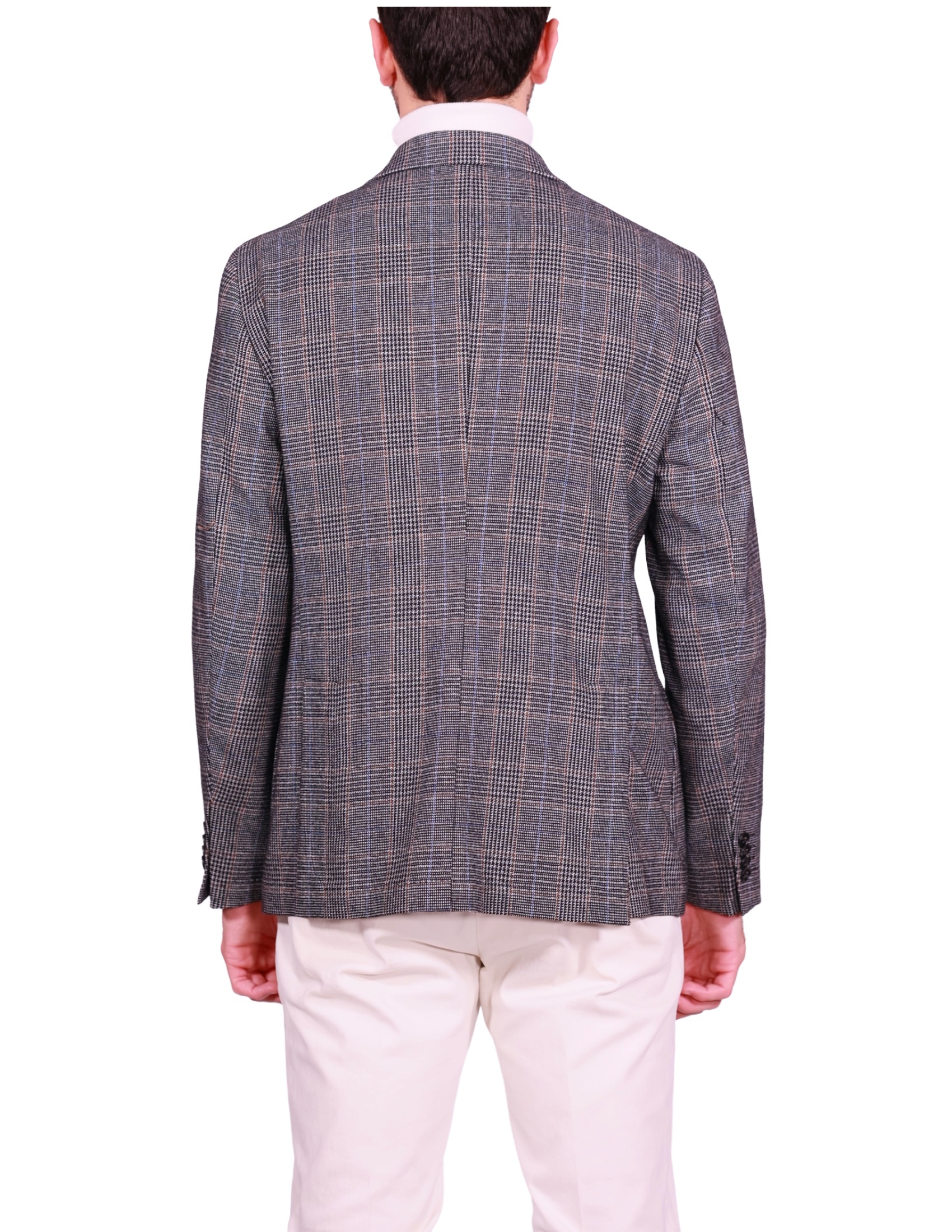 Il tessuto tecnico (56% Cotone, 20% Poliestere, 16% Lana, 6% Poliammide, 2% Altre Fibre) offre una vestibilità moderna e una buona tenuta della forma. La fantasia è un ricercato motivo a quadri (simile al Tartan o Glen Check) con toni di Grigio, Beige e Blu, creando un effetto cromatico sofisticato e autunnale.