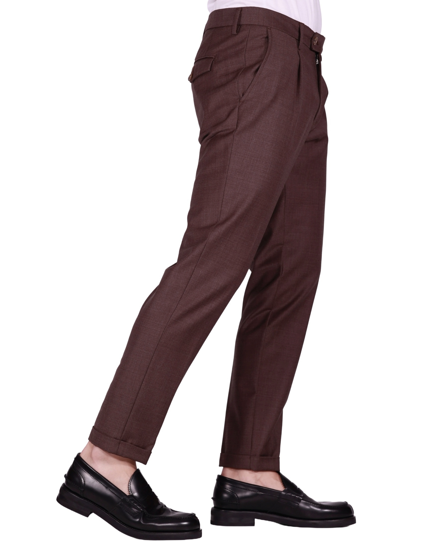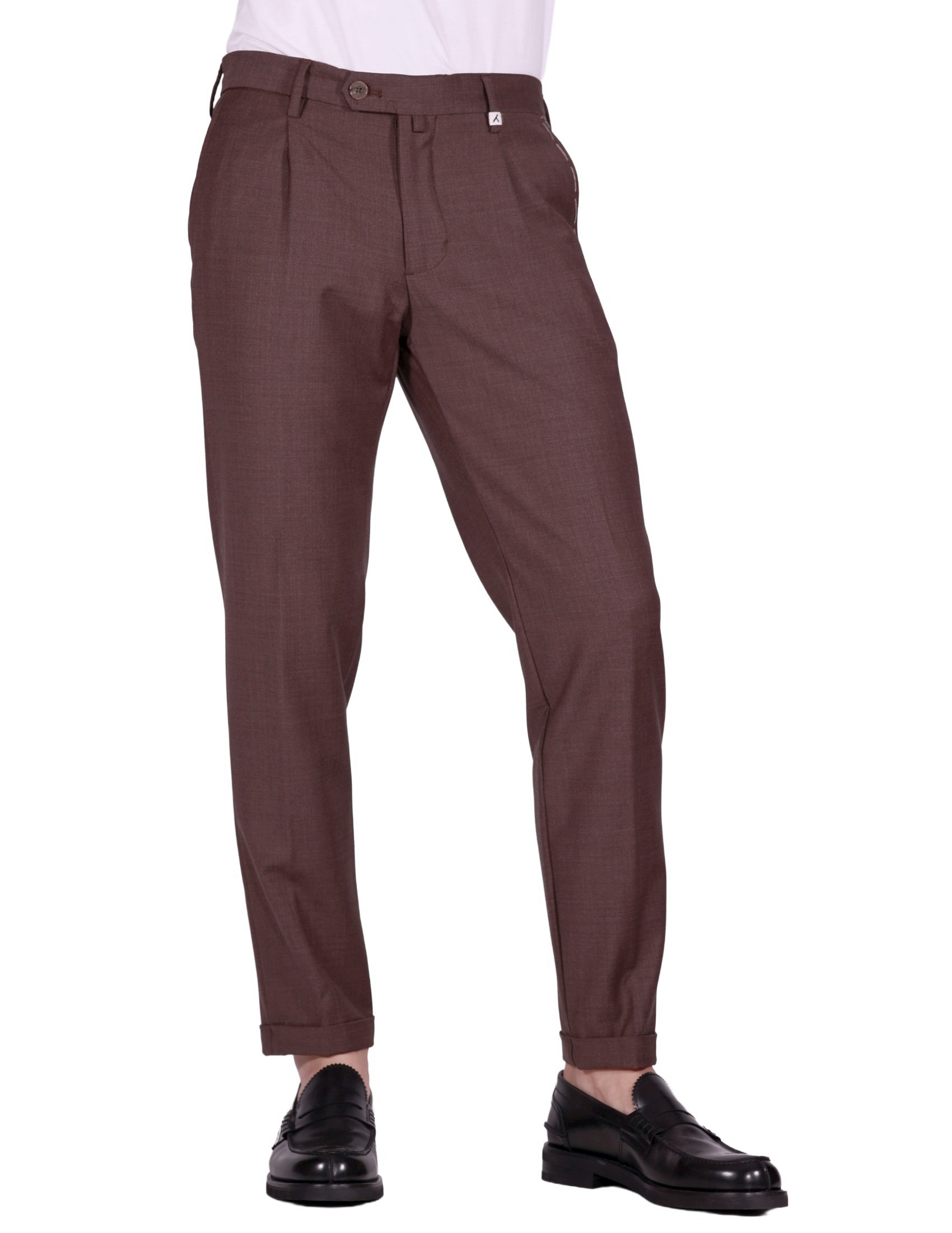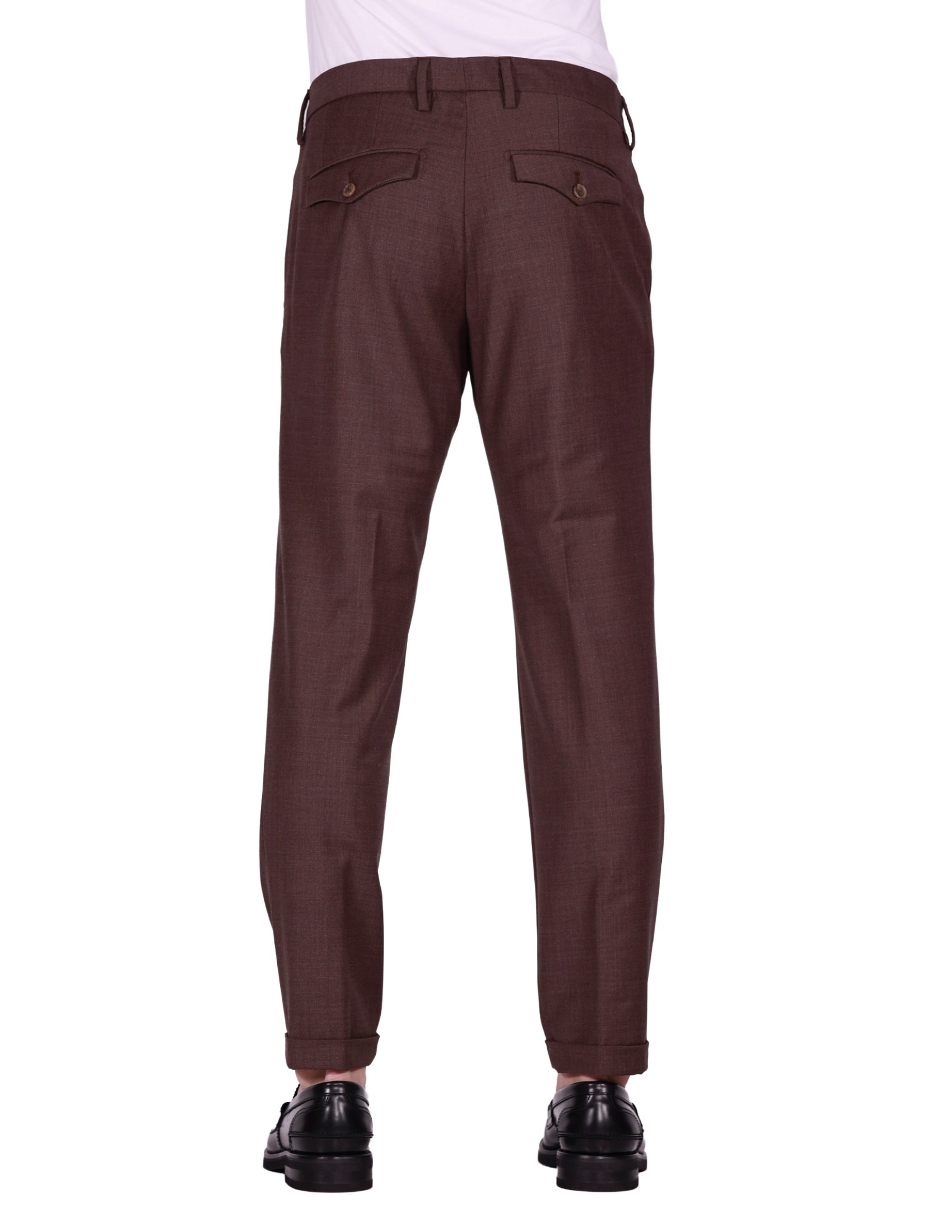 Questo Pantalone Myths è un capo versatile che unisce la formalità della lana alla comodità del tessuto stretch, perfetto per l'ufficio e il tempo libero. Realizzato con una composizione in Lana Prevalente (52% Lana, 43% Poliestere, 5% Elastan), il pantalone offre un'ottima tenuta, morbidezza e una vestibilità flessibile grazie all'Elastan. Il colore Marrone è una scelta calda e sofisticata per la stagione fredda. Il design presenta una pince (piega) singola e una vita sartoriale, con tasche a filo posteriori chiudibili con bottone. Il taglio è affusolato e il fondo con risvolto ne esalta l'estetica contemporanea. Un Pantalone Myths: lana stretch, taglio sartoriale con pince e massimo comfort.