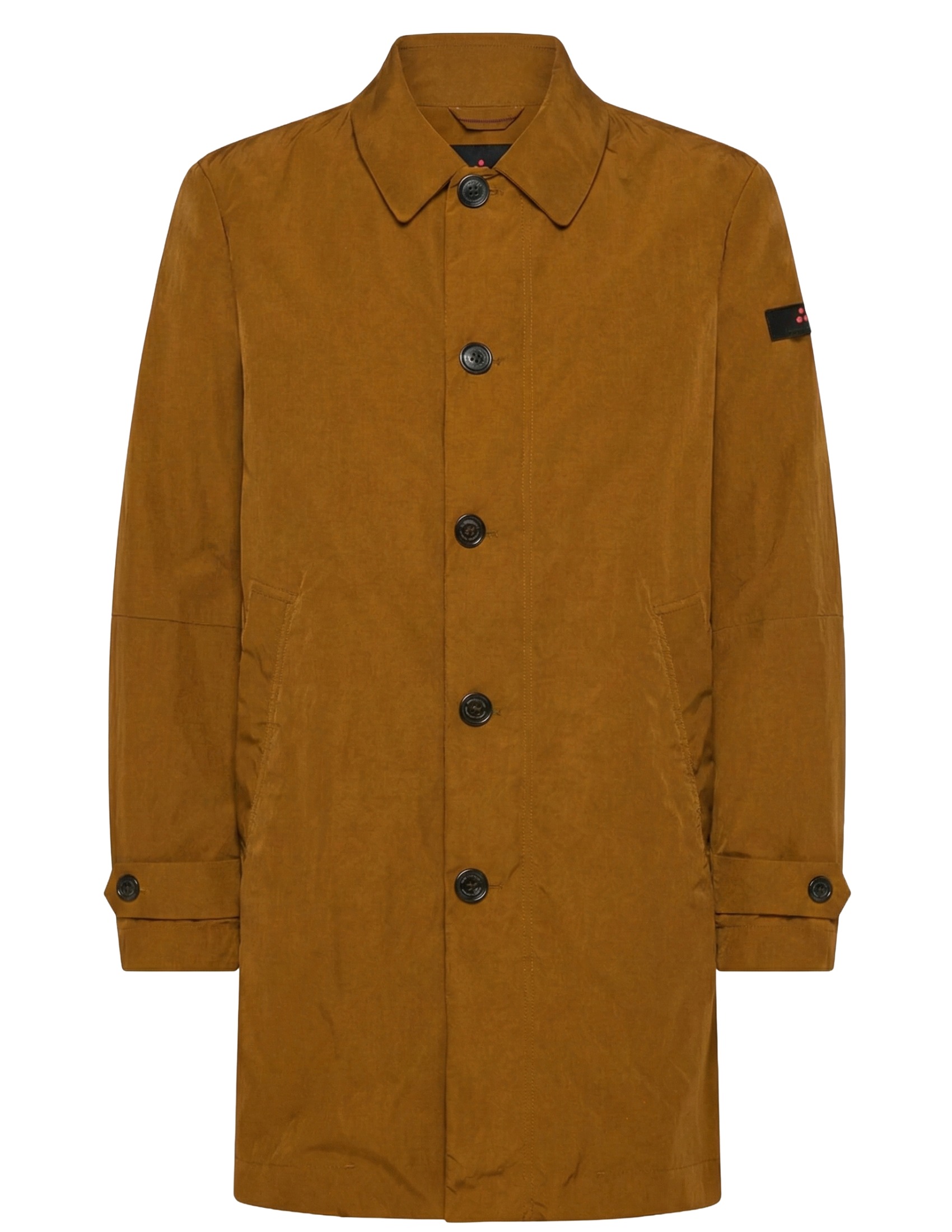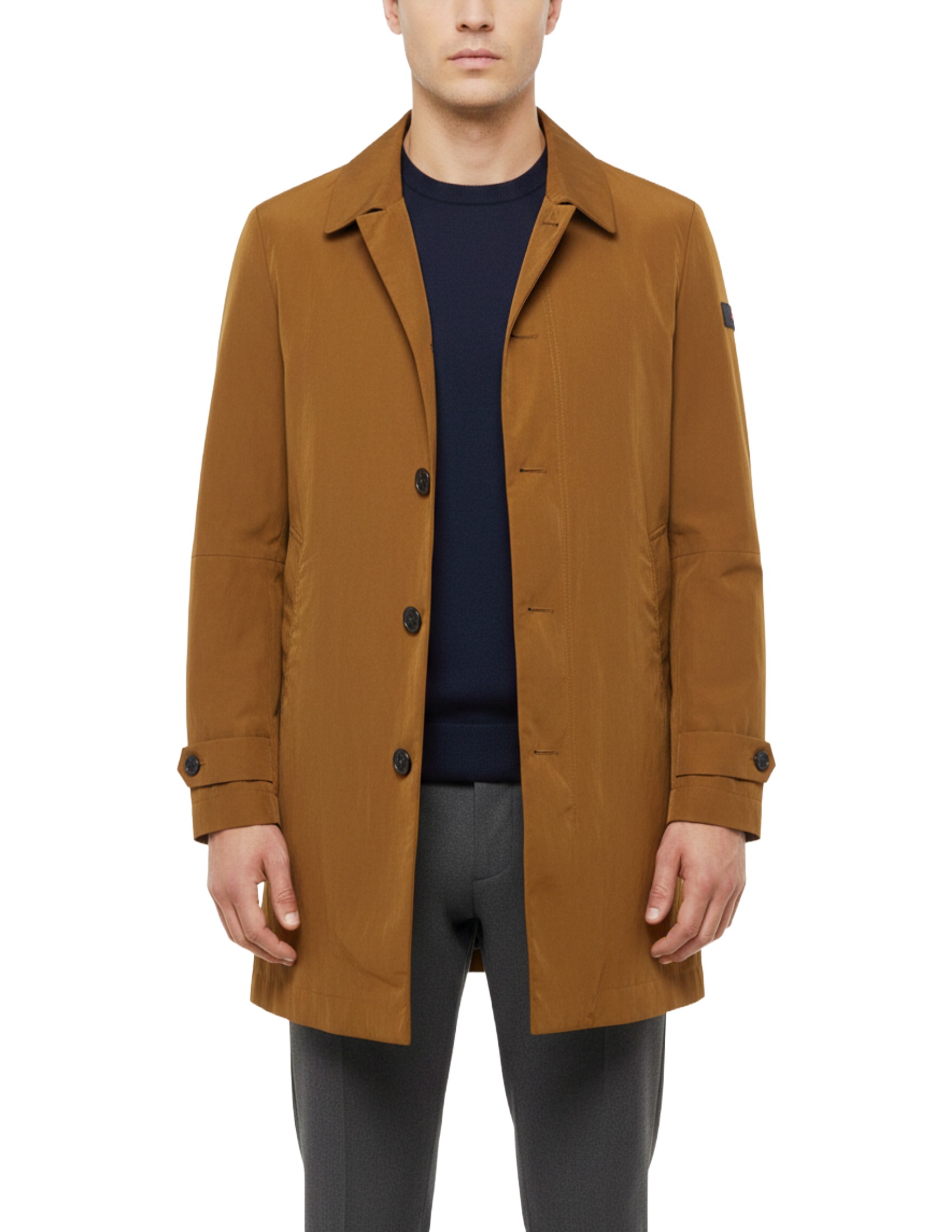 Trench realizzato in popeline di nylon e microfibra di poliestere dalla texture opaca, compatto e morbido al tatto, grazie alla tintura ad alte temperature. Un modello dalleleganza rigorosa che presenta chiusura centrale con bottoni, due ampie tasche laterali e lacci al fondo manica con asola e bottone. Dotato inoltre di membrana traspirante sul rovescio, il tessuto è waterproof e idrorepellente. Un capo sleek e raffinato, ideale per la mezza stagione in città o il tempo libero.