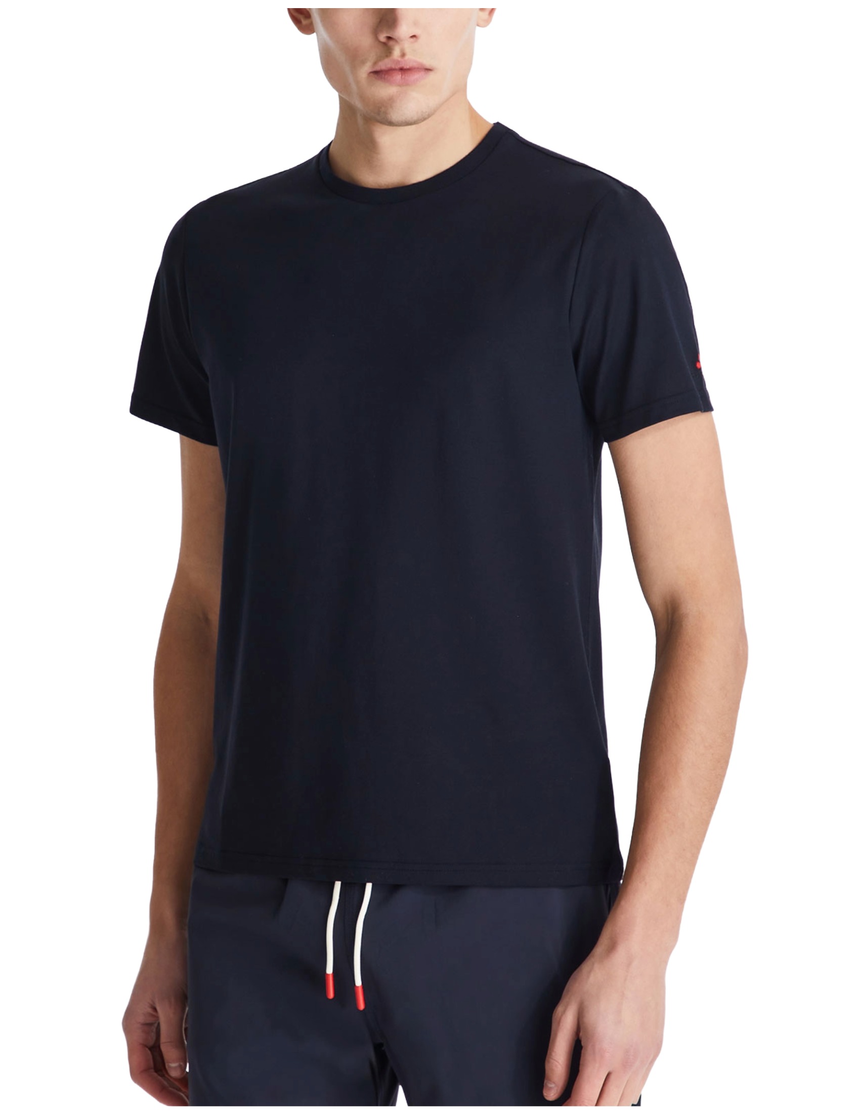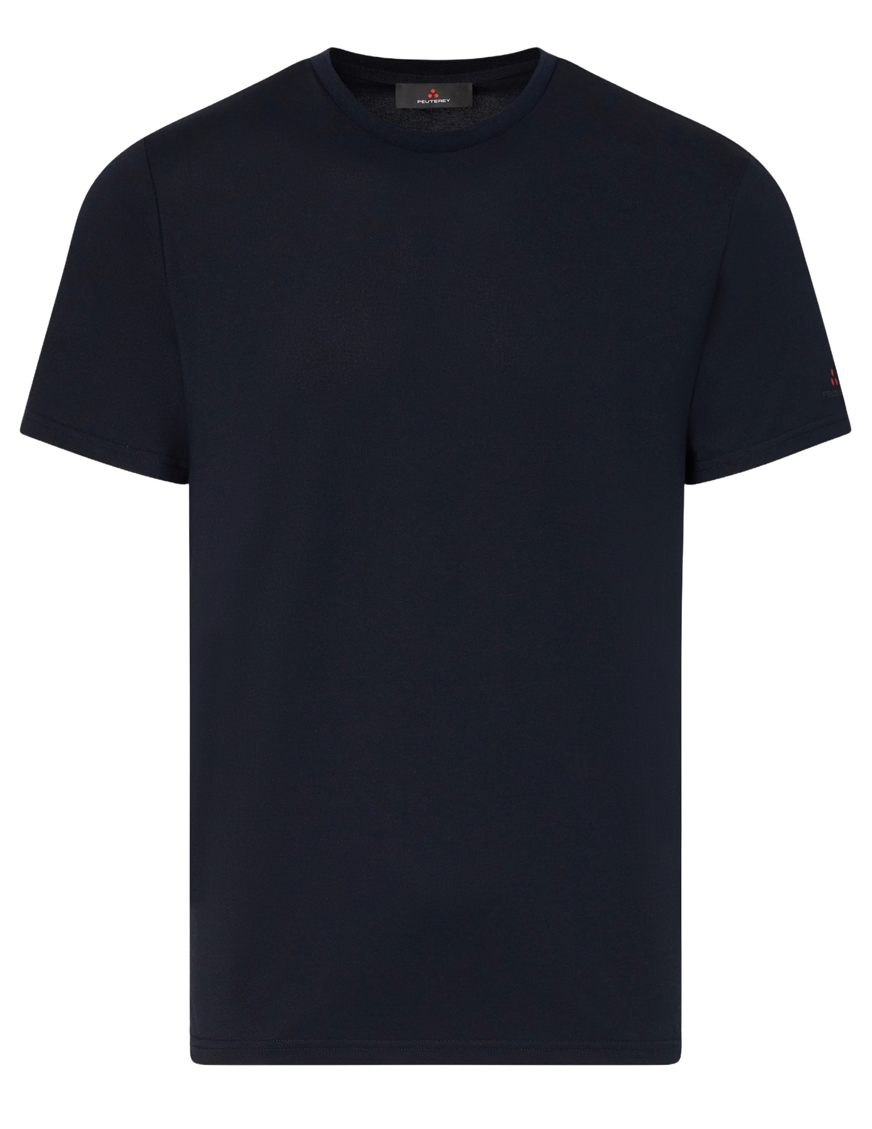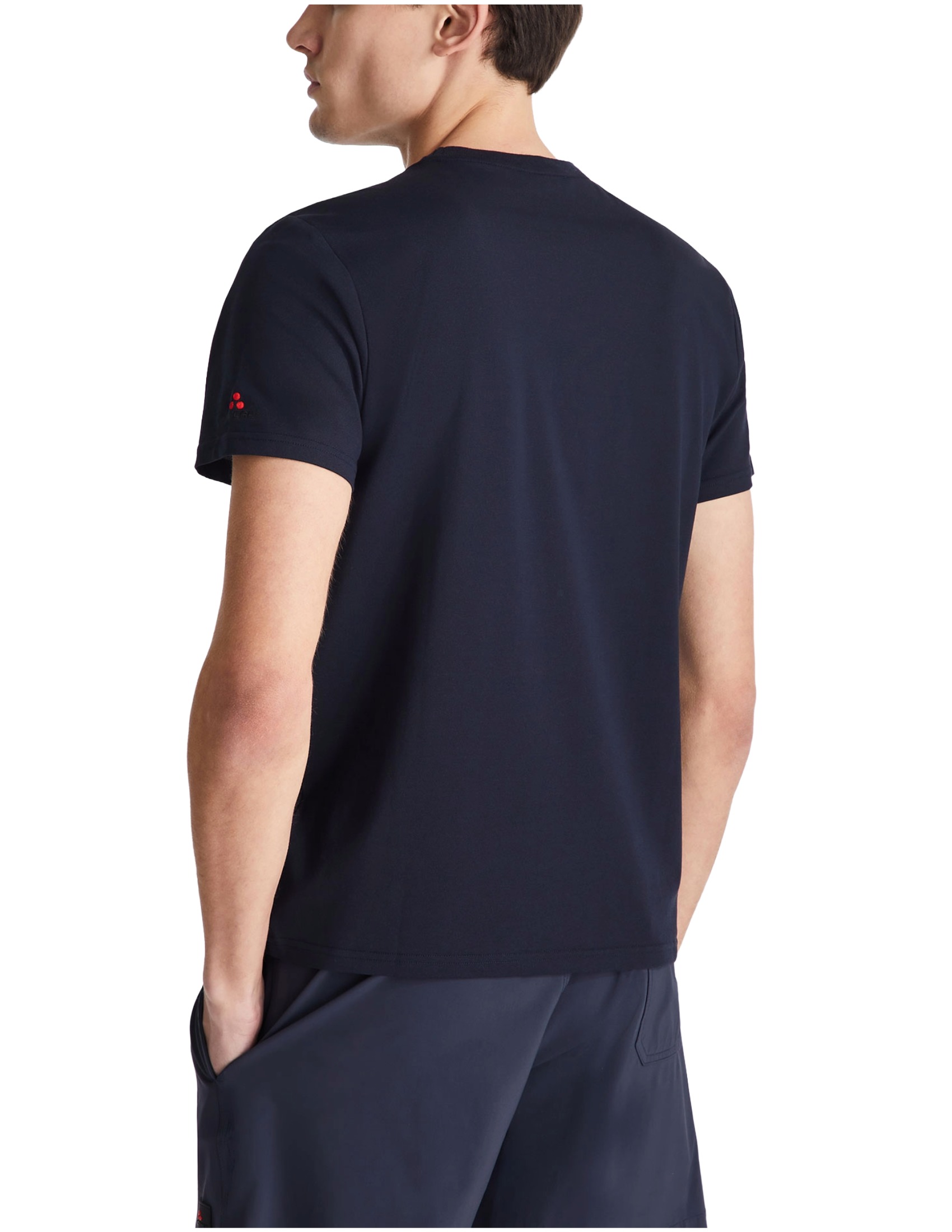 T-shirt in piquet stretch di cotone e seta, tinto in pezza, con logo ricamato sulla manica sinistra. Realizzata in un tessuto morbido, leggero e traspirante, è ideale per affrontare per la bella stagione con stile e comfort. Un modello versatile e moderno, perfetto come base per ogni guardaroba estivo, grazie alle sue infinite possibilità di abbinamento, per uno stile sempre impeccabile.
