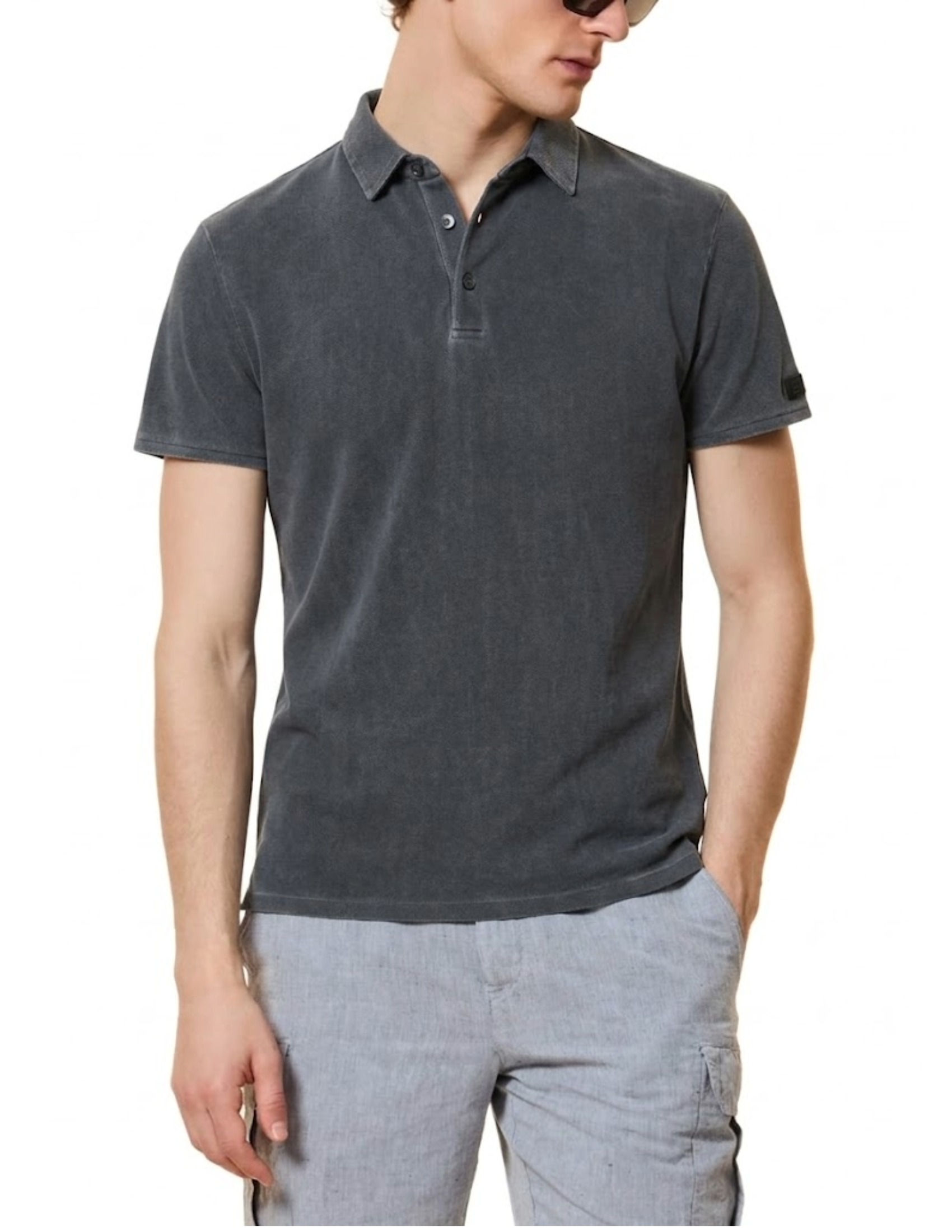 Uneleganza rilassata dallaspetto vissuto. Questa polo monocroma si distingue per il delicato effetto delavé del micro piquet, che conferisce una patina di autenticità al design essenziale. Il colletto a camicia, chiuso da tre bottoni in madreperla, introduce una nota vintage che accentua con personalità il design dal fit regolare. Il tessuto elasticizzato traspirante, dalle qualità antipiega, easy care e a rapida asciugatura, assicura comfort e freschezza. Perfetta per vivere unestate in cui mare e cielo si confondono allorizzonte, questa polo si abbina naturalmente a bermuda cargo o a modelli effetto used della Collezione. Il logo a microiniezione nero sulla manica sinistra aggiunge una nota di stile inconfondibile.