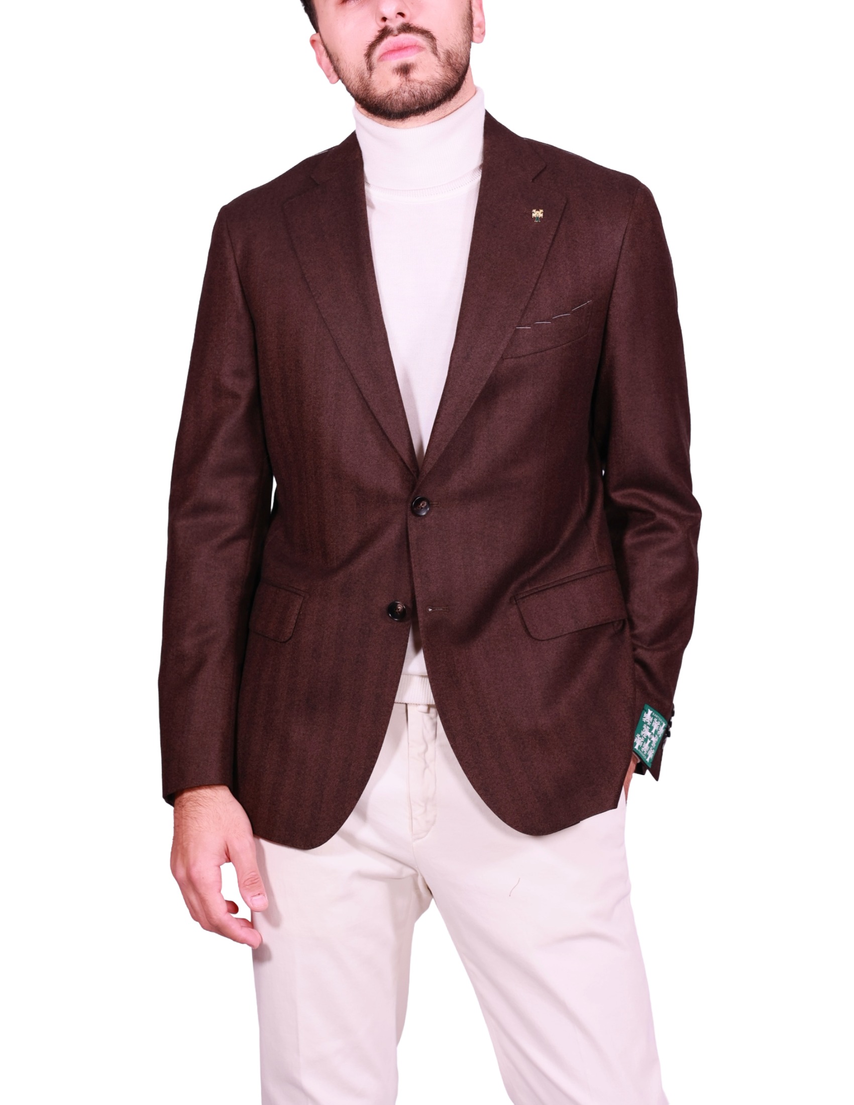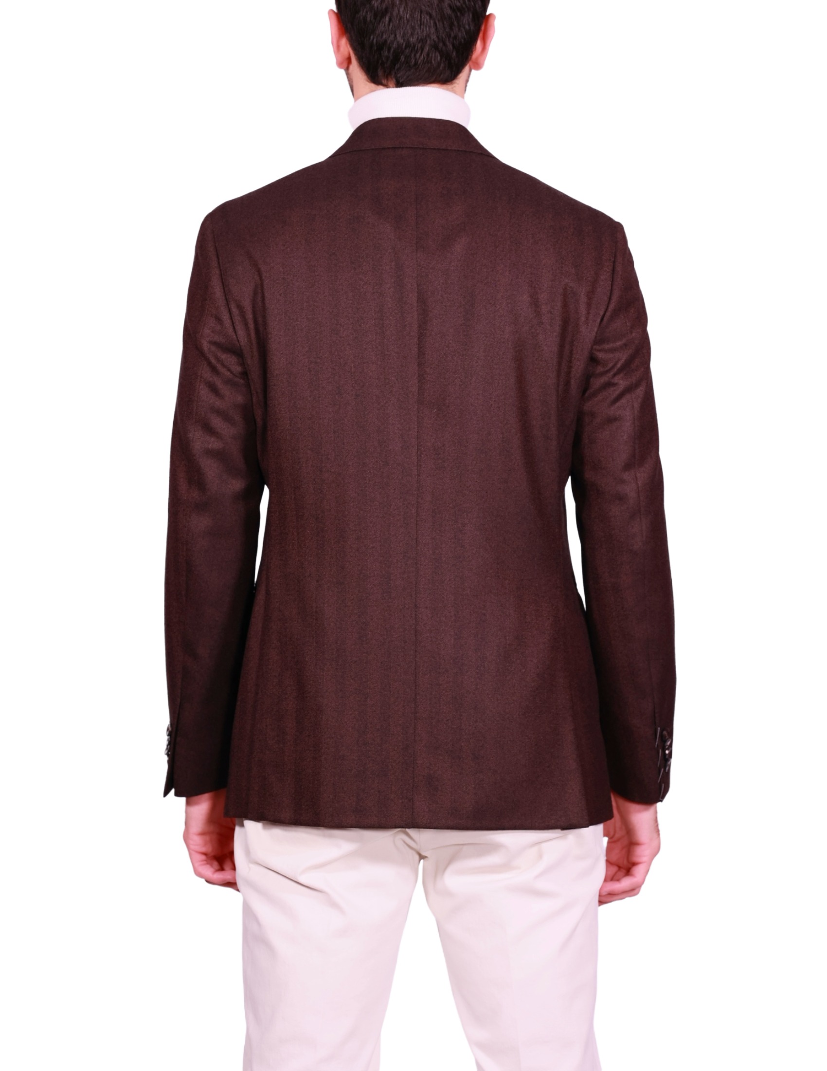 Il tessuto è 100% Lana Vergine, garantendo un capo di lusso con un eccellente calore e una mano morbida. La trama è un distintivo spigato (Herringbone) in una ricca tonalità di Marrone Scuro/Testa di Moro, che conferisce profondità e carattere.