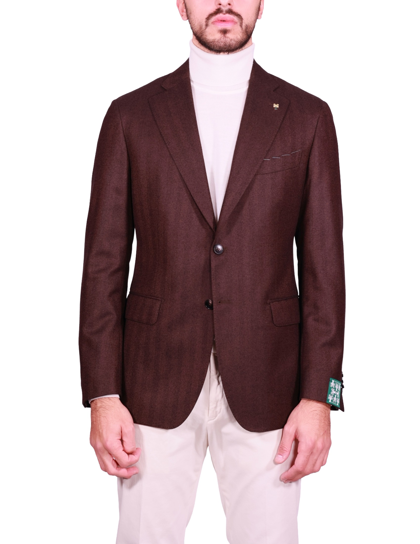 Il design è un blazer monopetto con chiusura a due bottoni e revers classici. Il taglio "Napoli" suggerisce una spalla leggera e destrutturata, simbolo della tradizione sartoriale campana, che offre una vestibilità naturale ed estremamente confortevole.