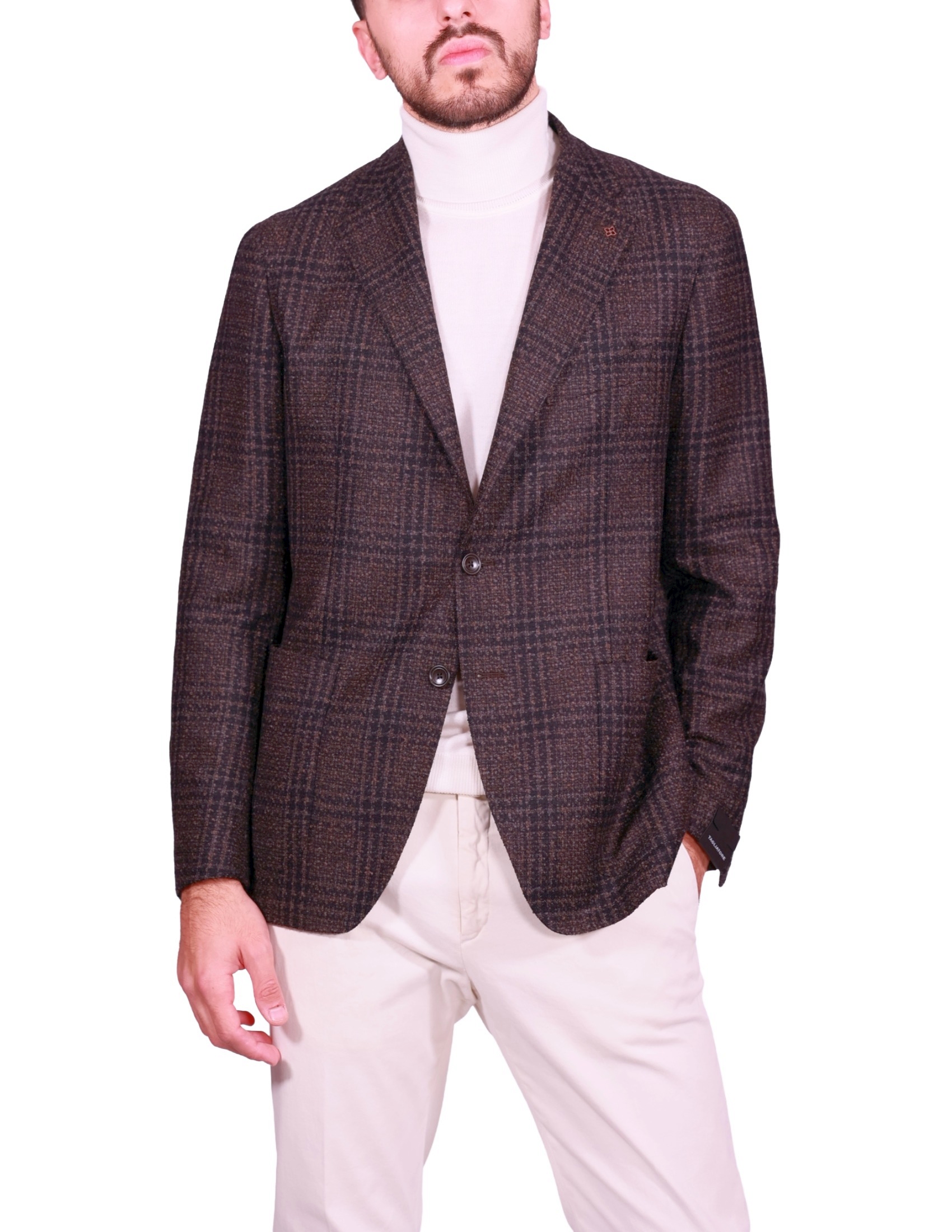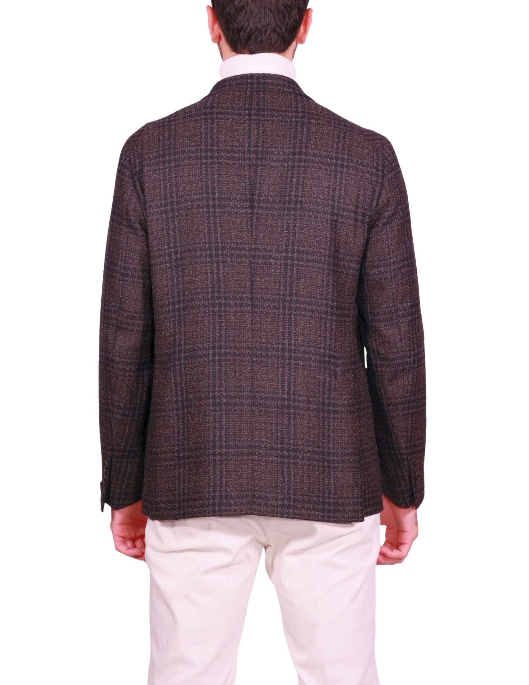Il tessuto è prevalentemente in Lana (86% Lana, 14% Poliestere), garantendo calore e una mano strutturata, ideale per la stagione fredda. La fantasia è un elegante motivo a quadri (Prince of Wales o Windowpane) su base Marrone/Testa di Moro, che conferisce profondità e un look country-chic.